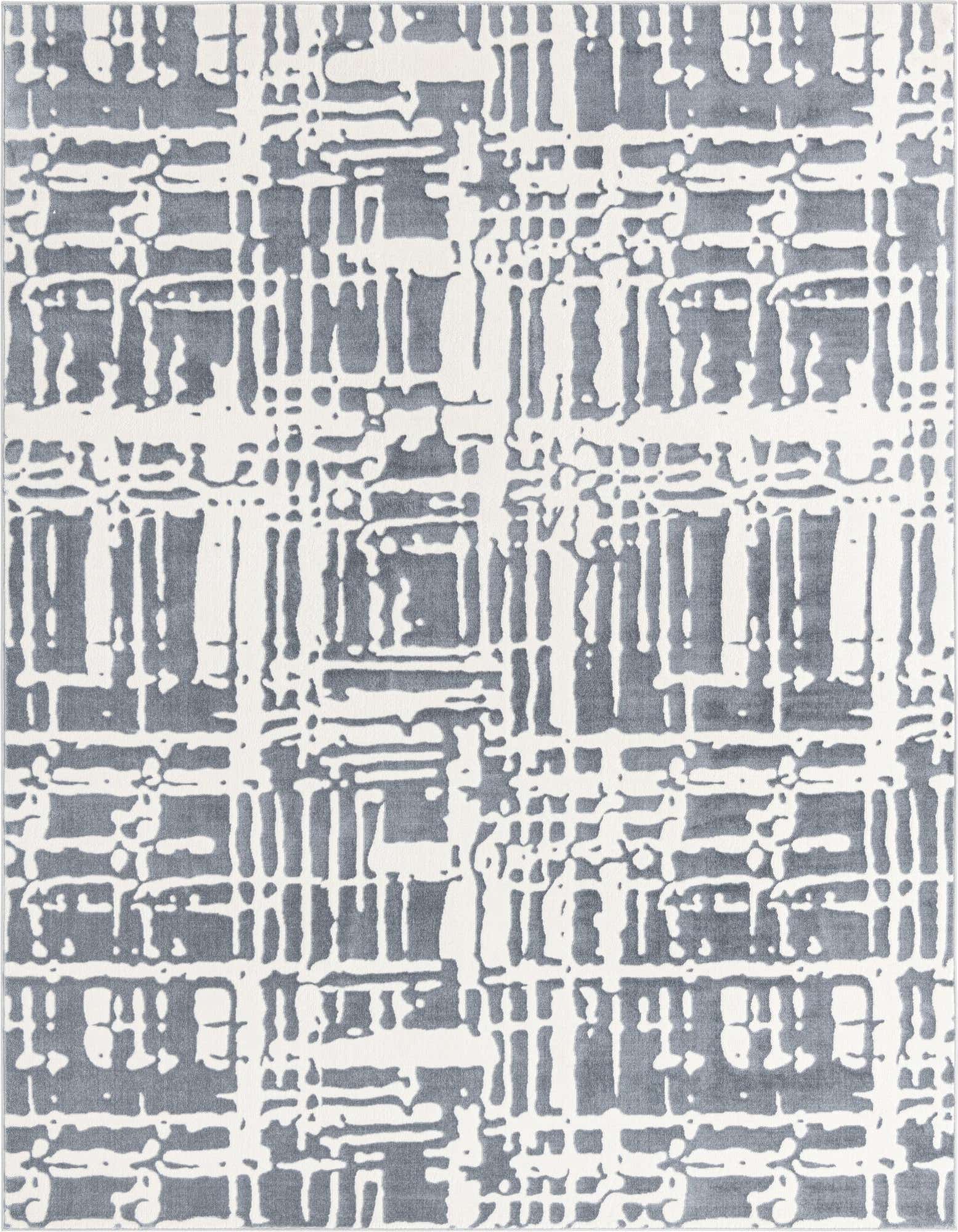 A rectangular 8x10 gray and white modern abstract area rug with a textured, high pile.