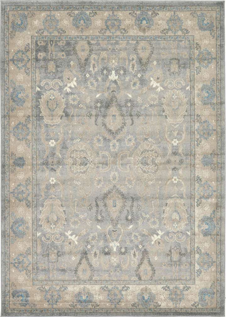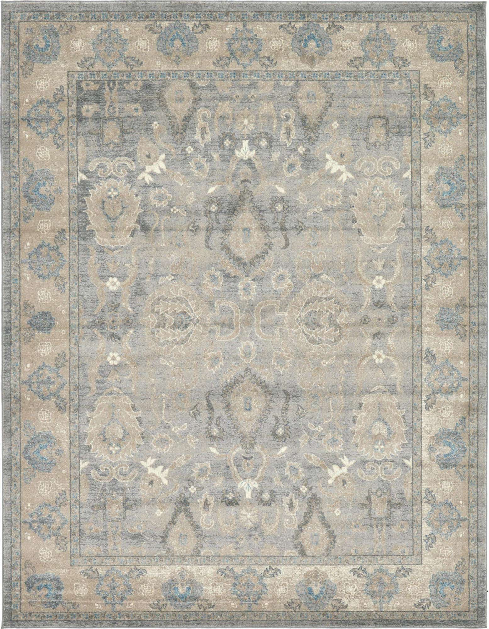 Primary color is Gray. Colors in this rug include: Gray, Light Blue, Ivory.