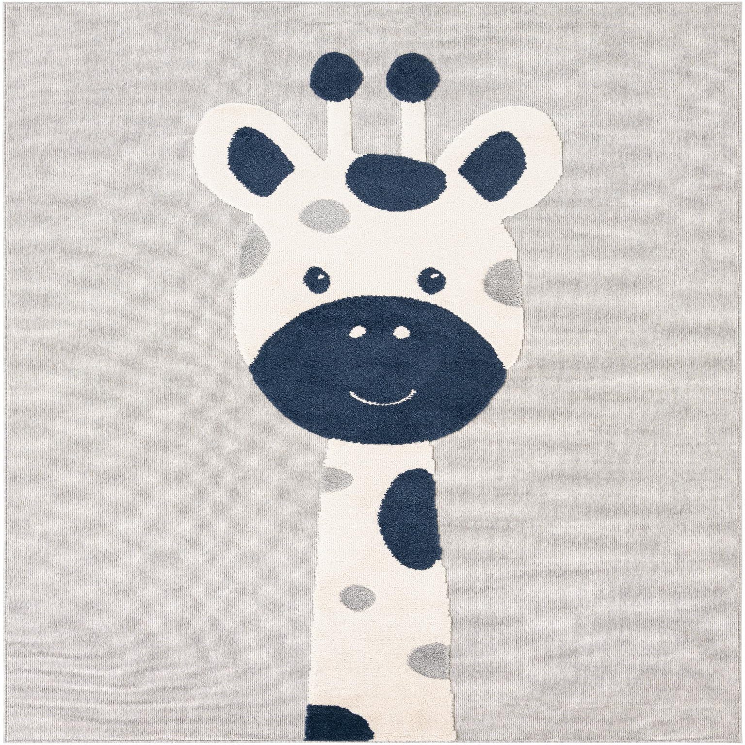 A rectangular 8x10 gray area rug featuring a large, friendly giraffe face in white, navy, and light gray, perfect for a child's bedroom.