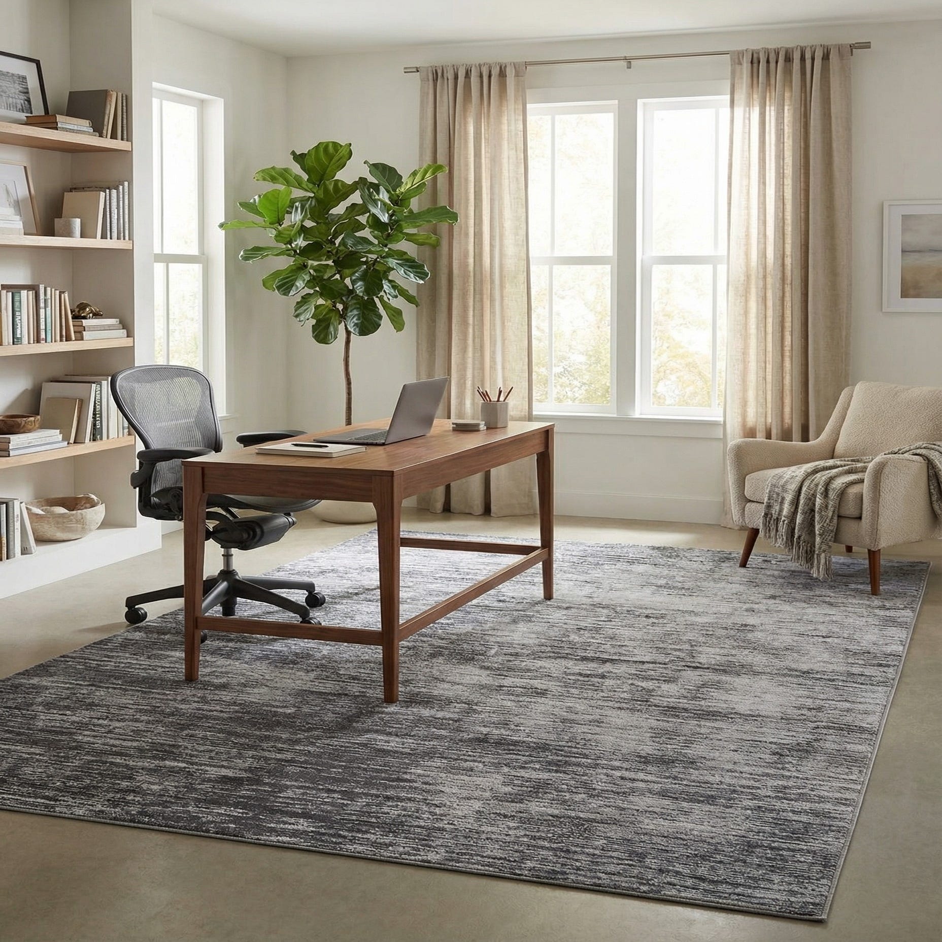 Durable and practical, this rug is specifically designed to be stain-resistant, shed-free, and pet-friendly, ensuring longevity even in high-traffic areas or homes with pets. Its understated pattern and neutral color palette make it versatile for a variety of interior design scenarios. It would complement a minimalist aesthetic, enhance a contemporary space, or provide a soft backdrop in a Scandinavian-inspired setting. This piece could easily anchor a living room, define a dining space, or add a refined touch to a bedroom, harmonizing well with both light and dark furniture tones.