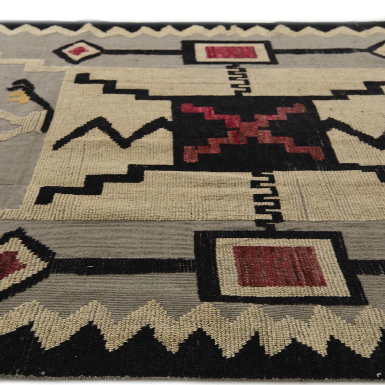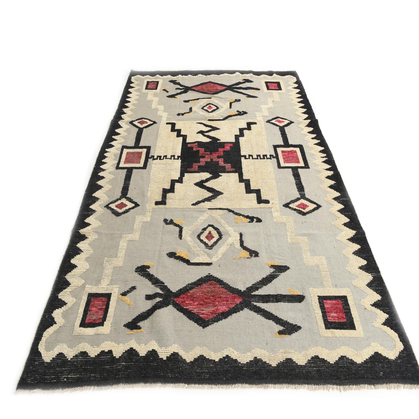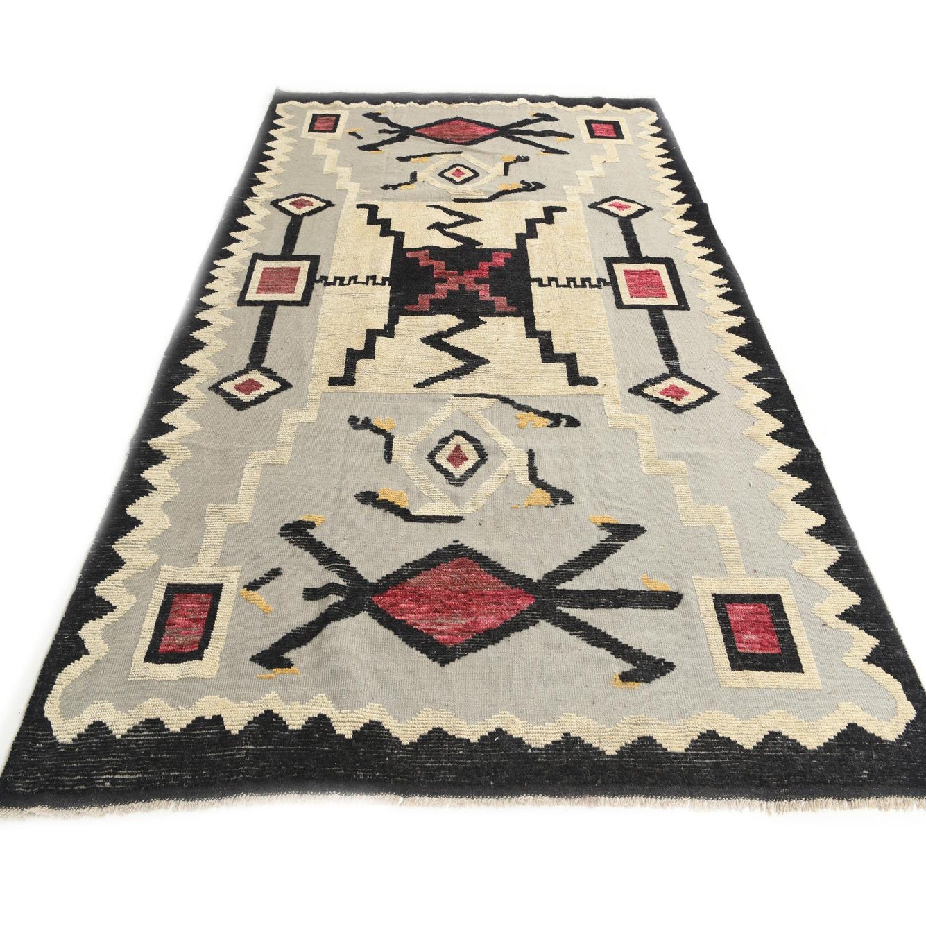 The Darya collection presents a distinctive 8x11 hand-knotted rug, crafted from 100% wool for a natural, resilient texture. The rug features a balanced palette of gray, black, red, ivory, and yellow hues on a gray background, creating a harmonious blend of colors that can complement various interior themes. The piece showcases a bold geometric pattern, offering a strong visual statement with a tribal-inspired motif.