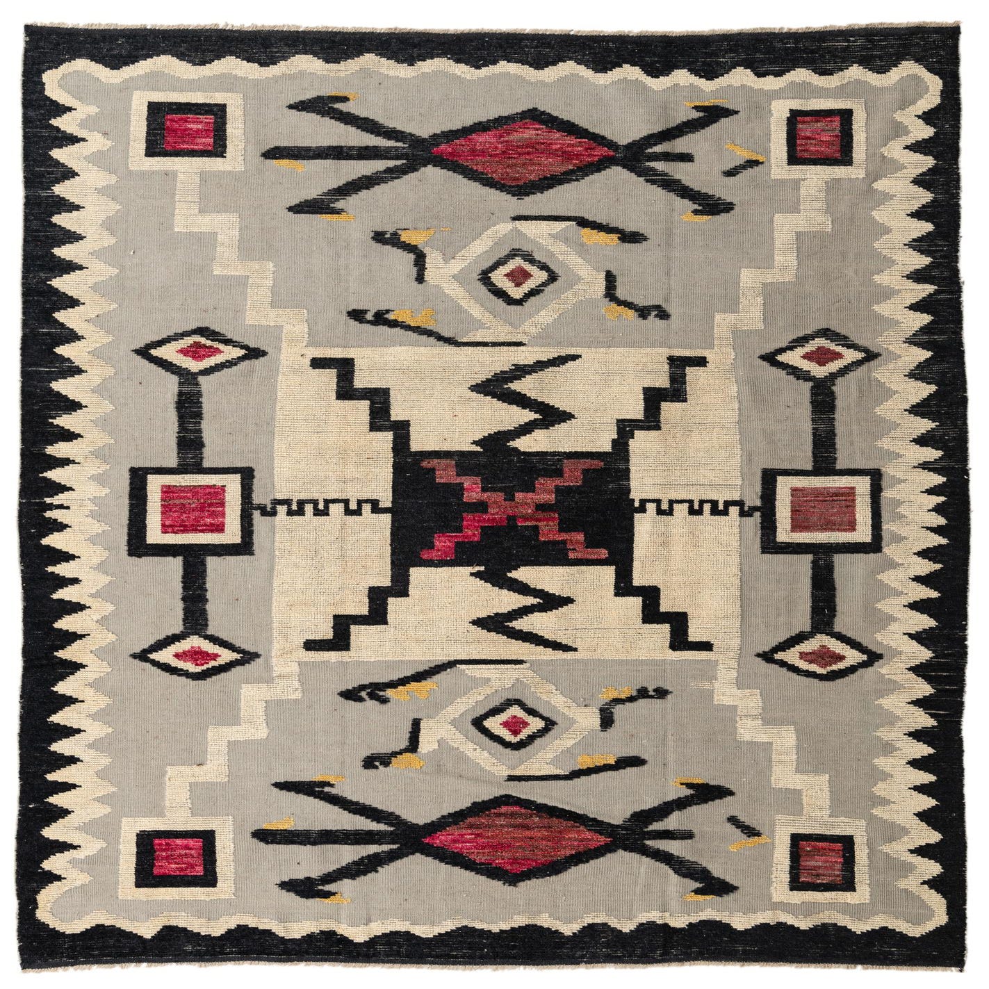 Primary color is Gray. Colors in this rug include: Gray, Black, Red, Ivory, Yellow.