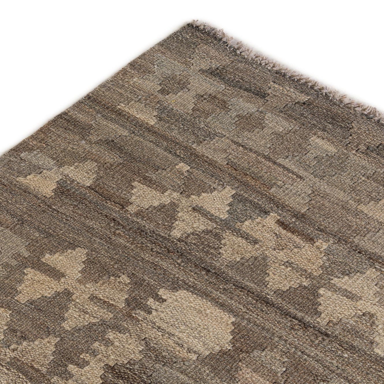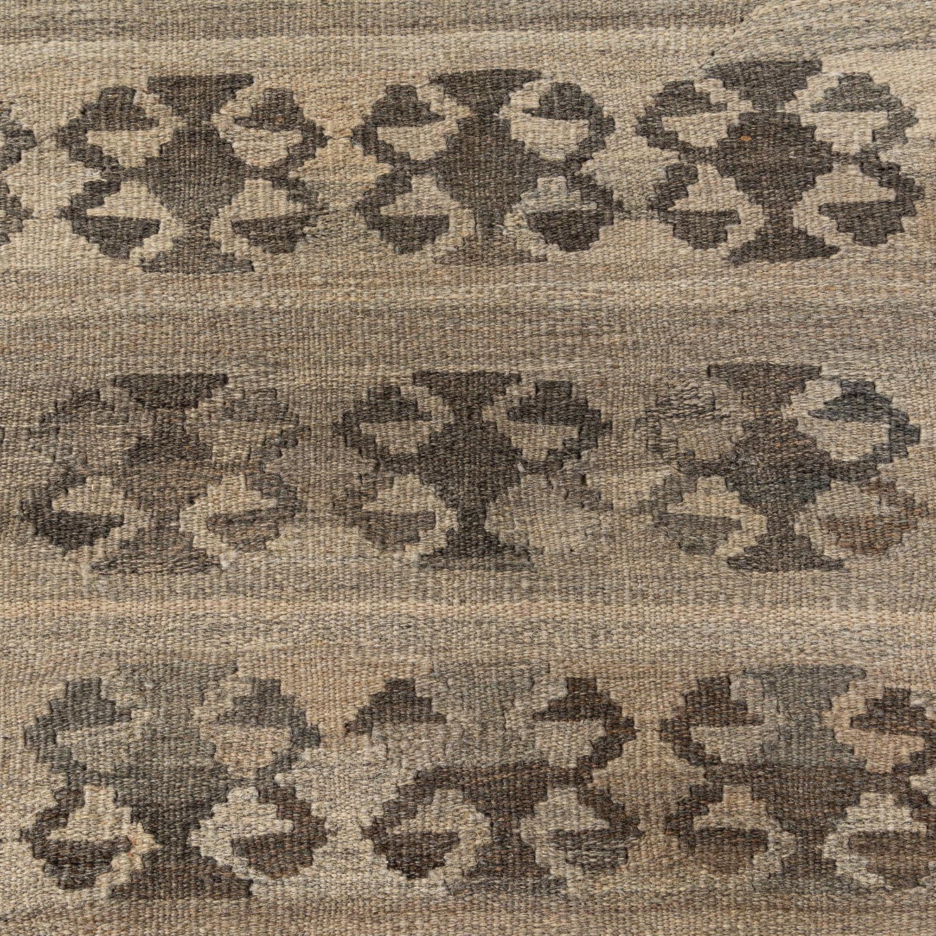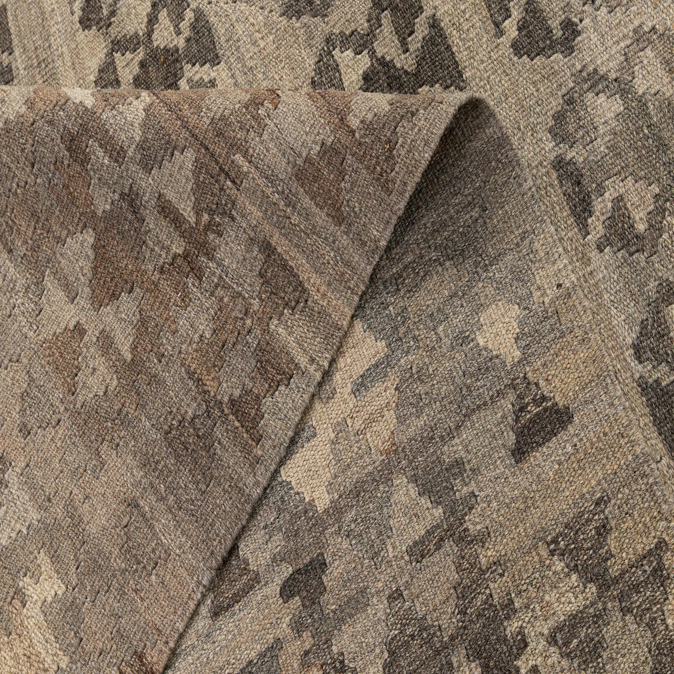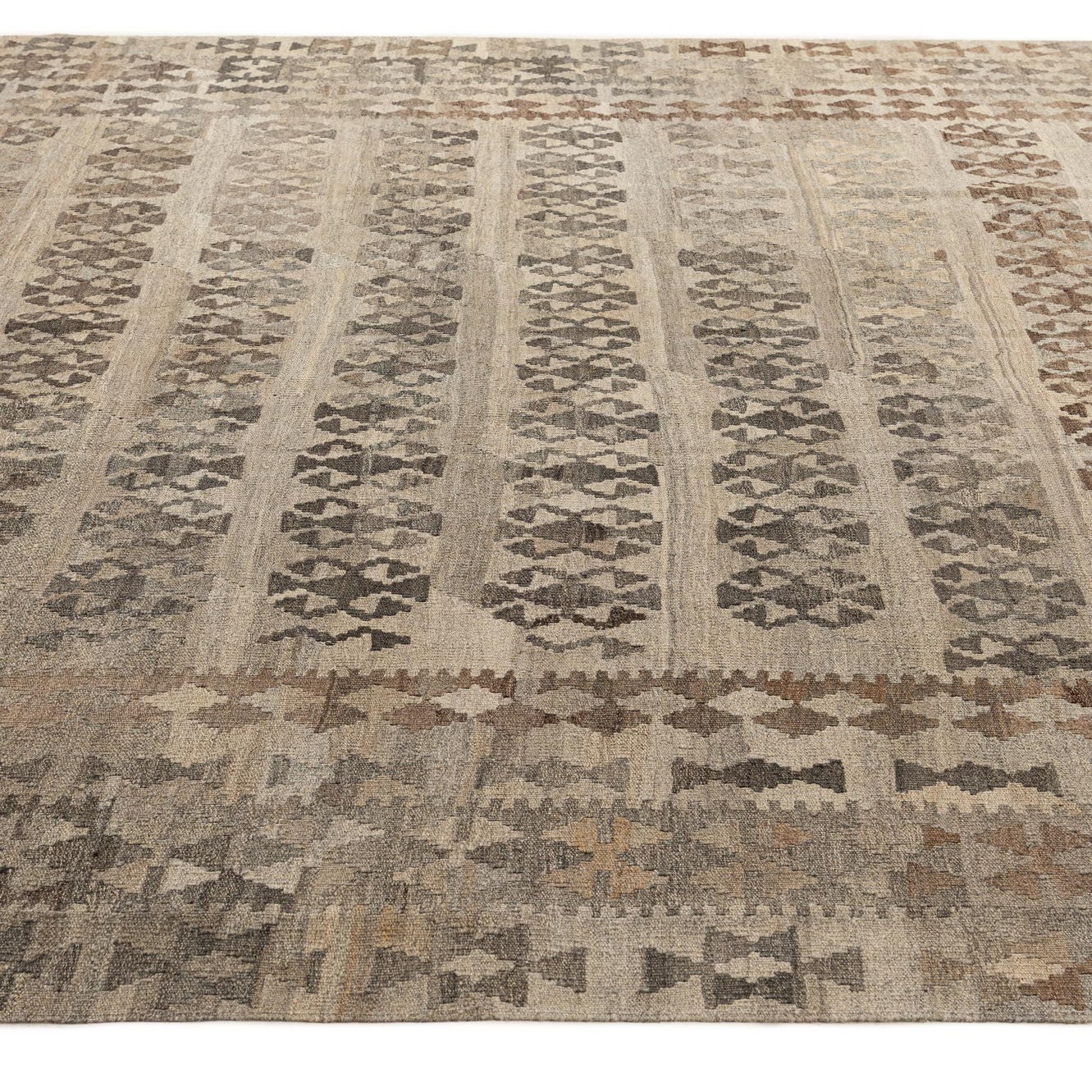 An 8x11 rectangular Kilim Maymana rug featuring a tribal pattern in varying shades of gray and silver, suitable for a living room.