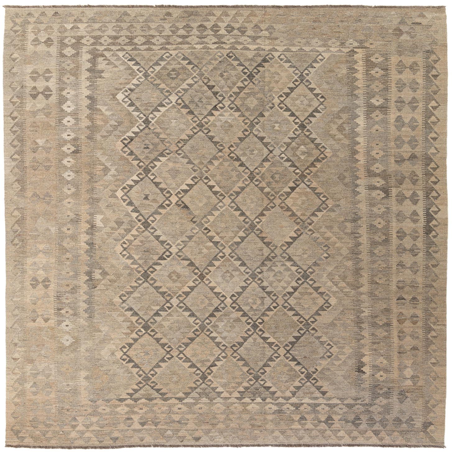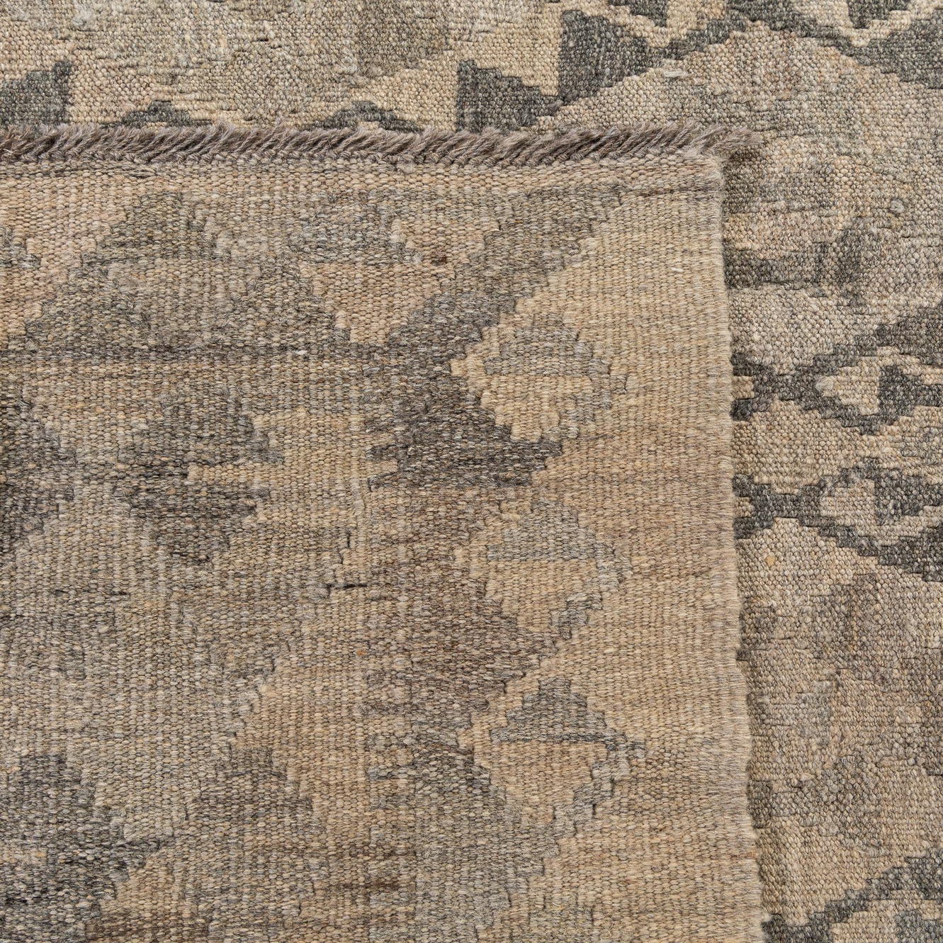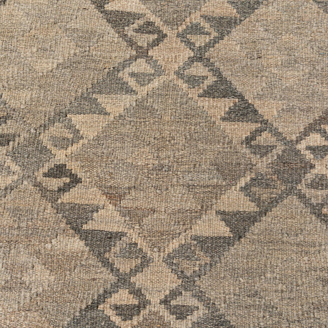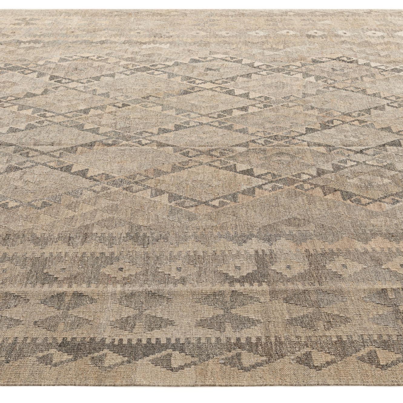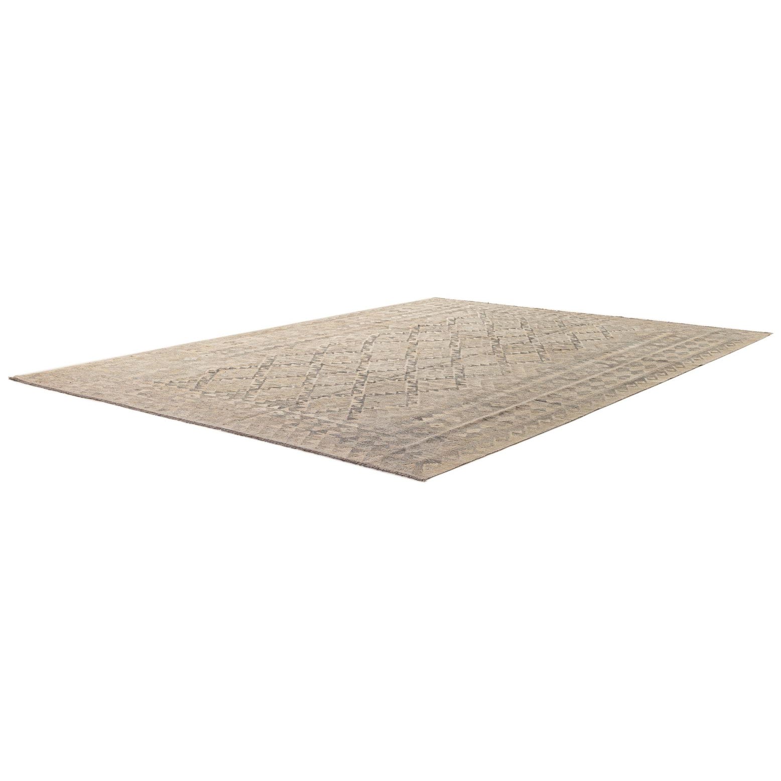 An 8x11 rectangular Kilim Maymana wool rug featuring a tribal diamond pattern in various shades of gray.