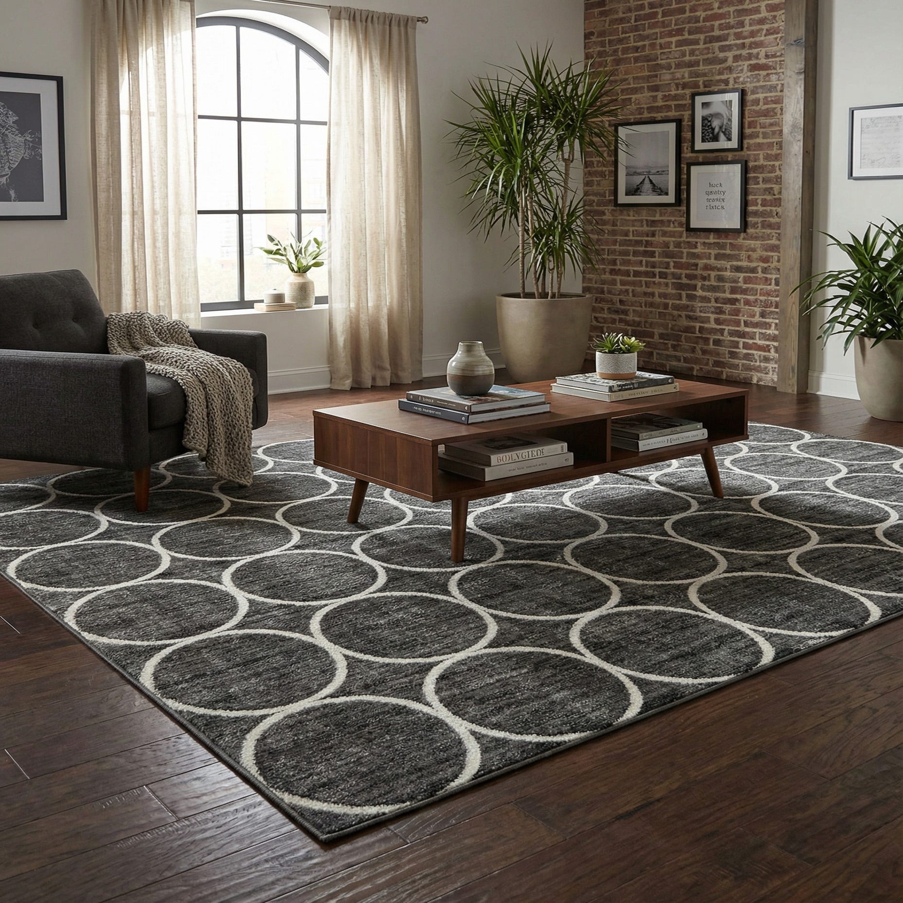 This rug works well to anchor a living room seating area or to define a dining space, and it pairs easily with warm wood furniture, black metal accents, leather pieces, or neutral upholstery. Use it in contemporary, mid-century modern, or transitional interiors where a bold graphic pattern can bring structure without overwhelming other finishes. The durable polyester construction is suited to everyday rooms such as family rooms, home offices, and entryways that benefit from an easy-care, stylish foundation.