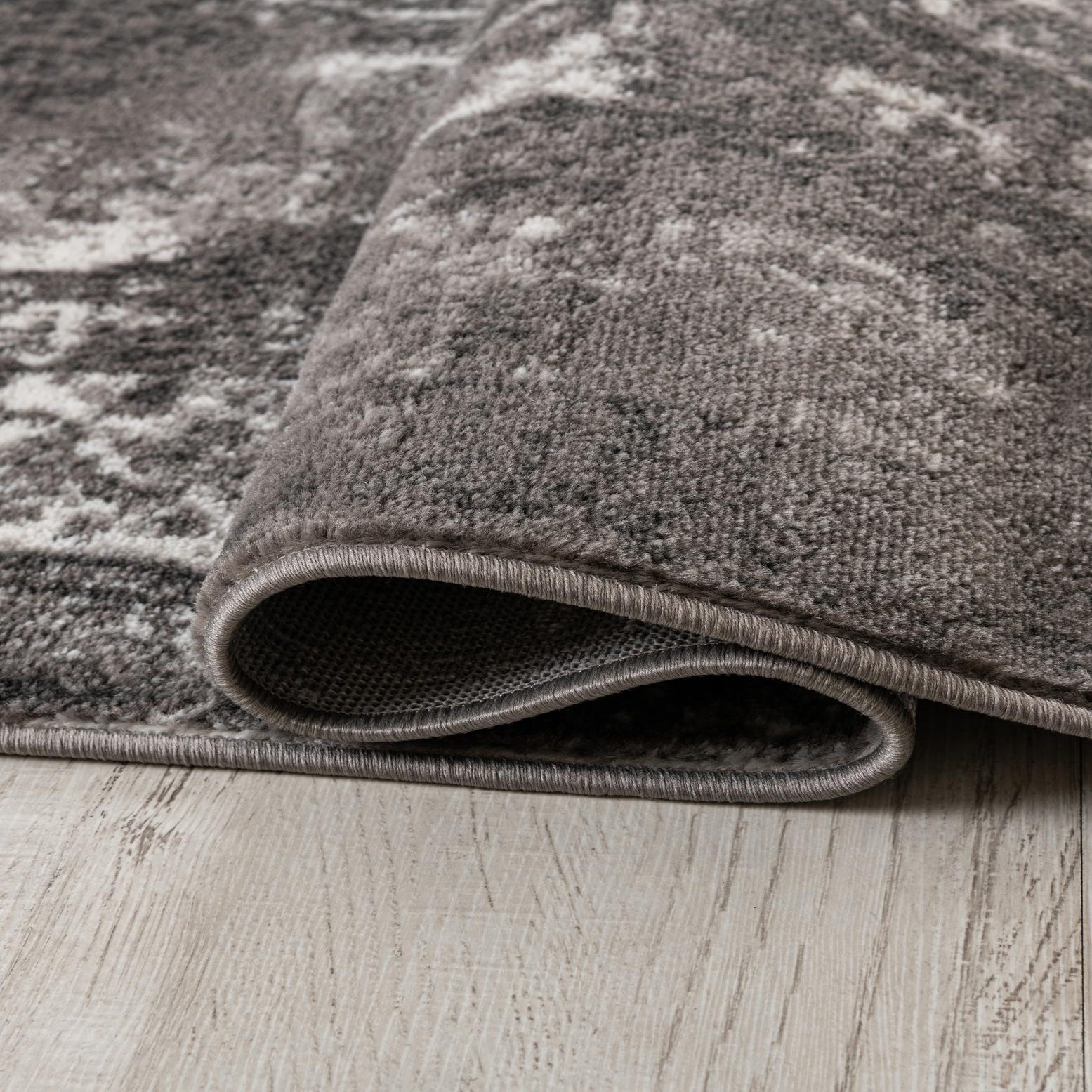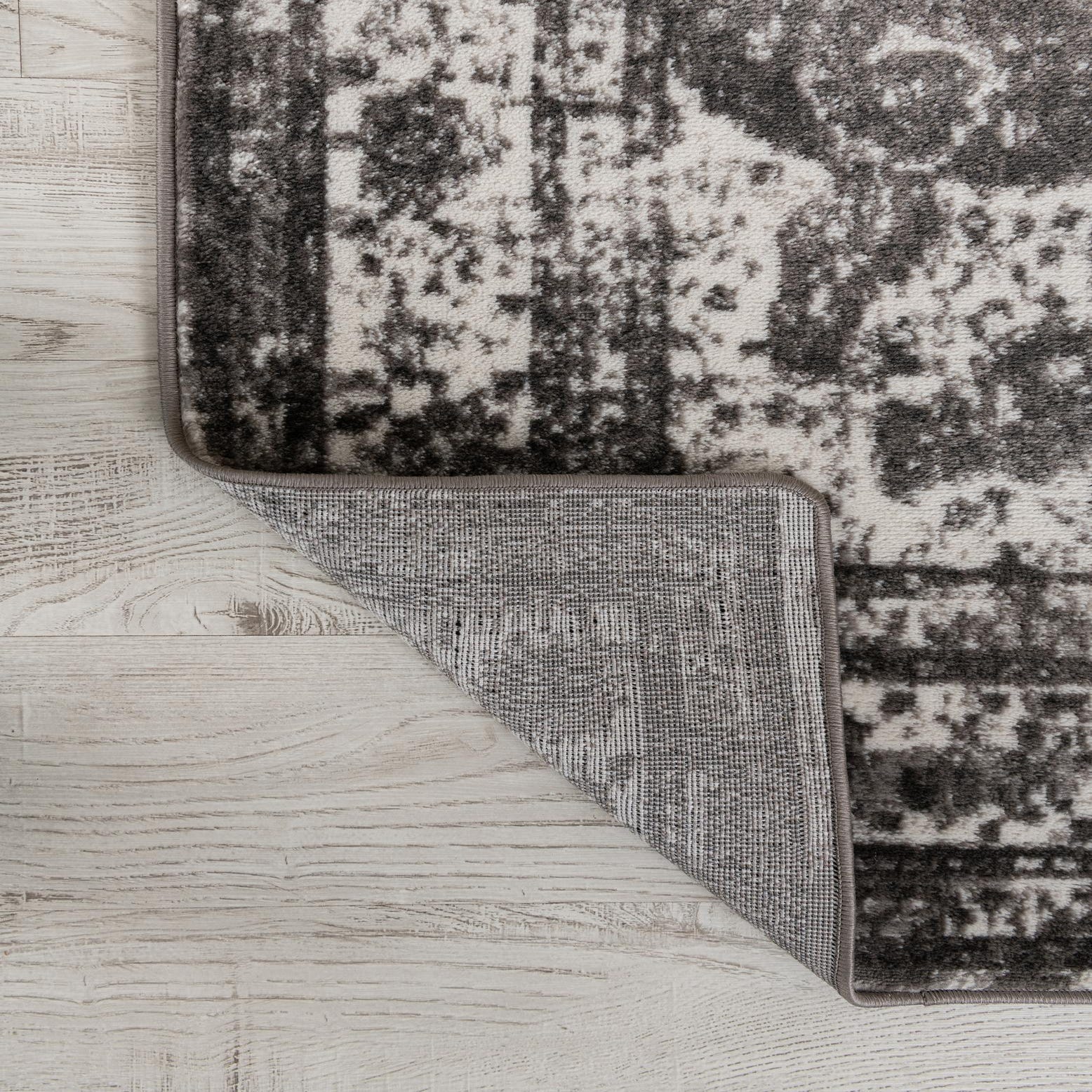 A large 8x11 rectangular indoor rug featuring a distressed medallion pattern in various shades of gray and silver.