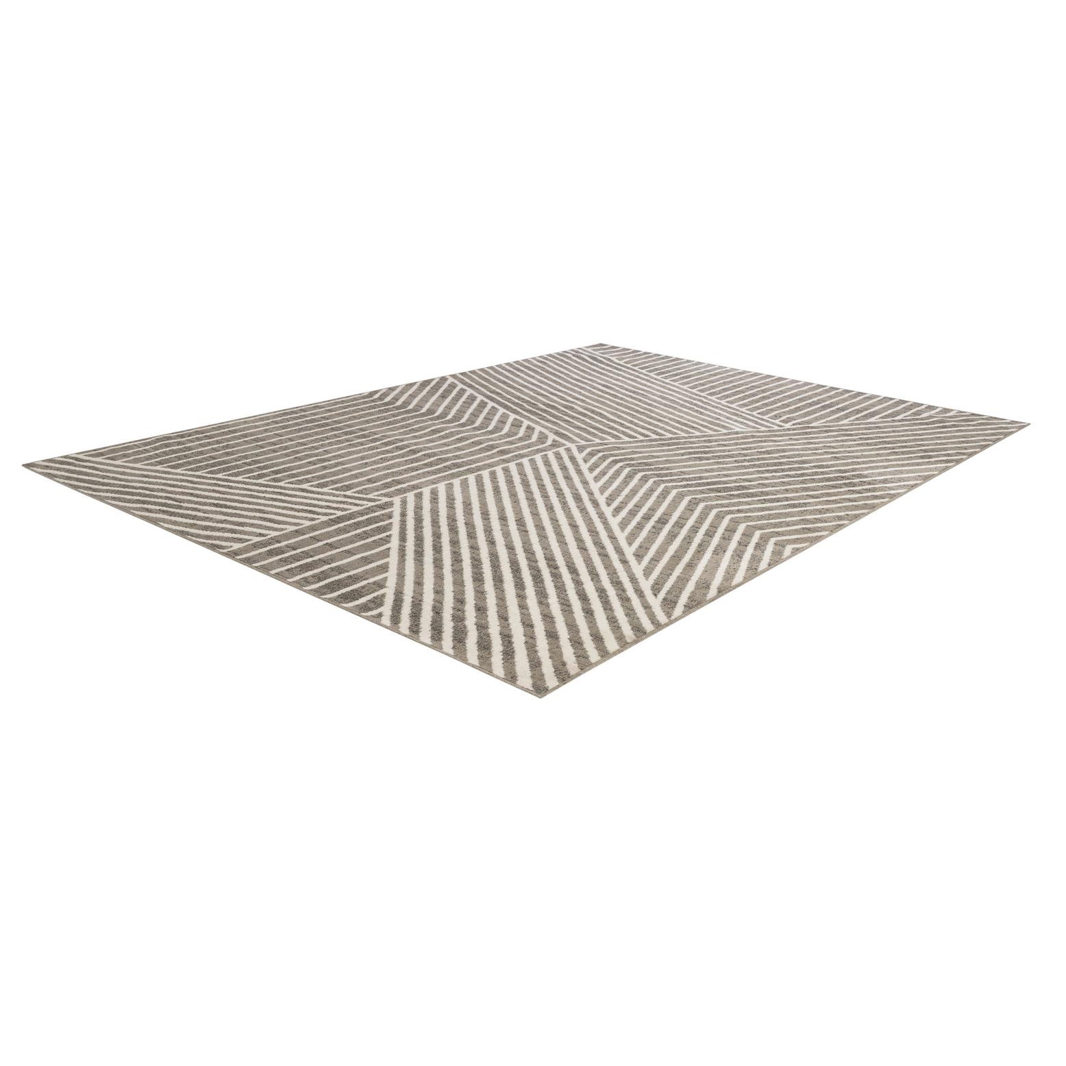 Machine-made of 100% polypropylene, the rug has a low, dense pile with a slightly cushioned feel underfoot and a subtle raised texture where the ivory stripes lift above the gray base. Use it to anchor a modern living room seating area, define a home office, or layer beneath a simple dining table; it pairs well with warm wood tones, black metal accents, leather pieces, and soft neutral upholstery, and complements both minimalist and mid-century inspired schemes.