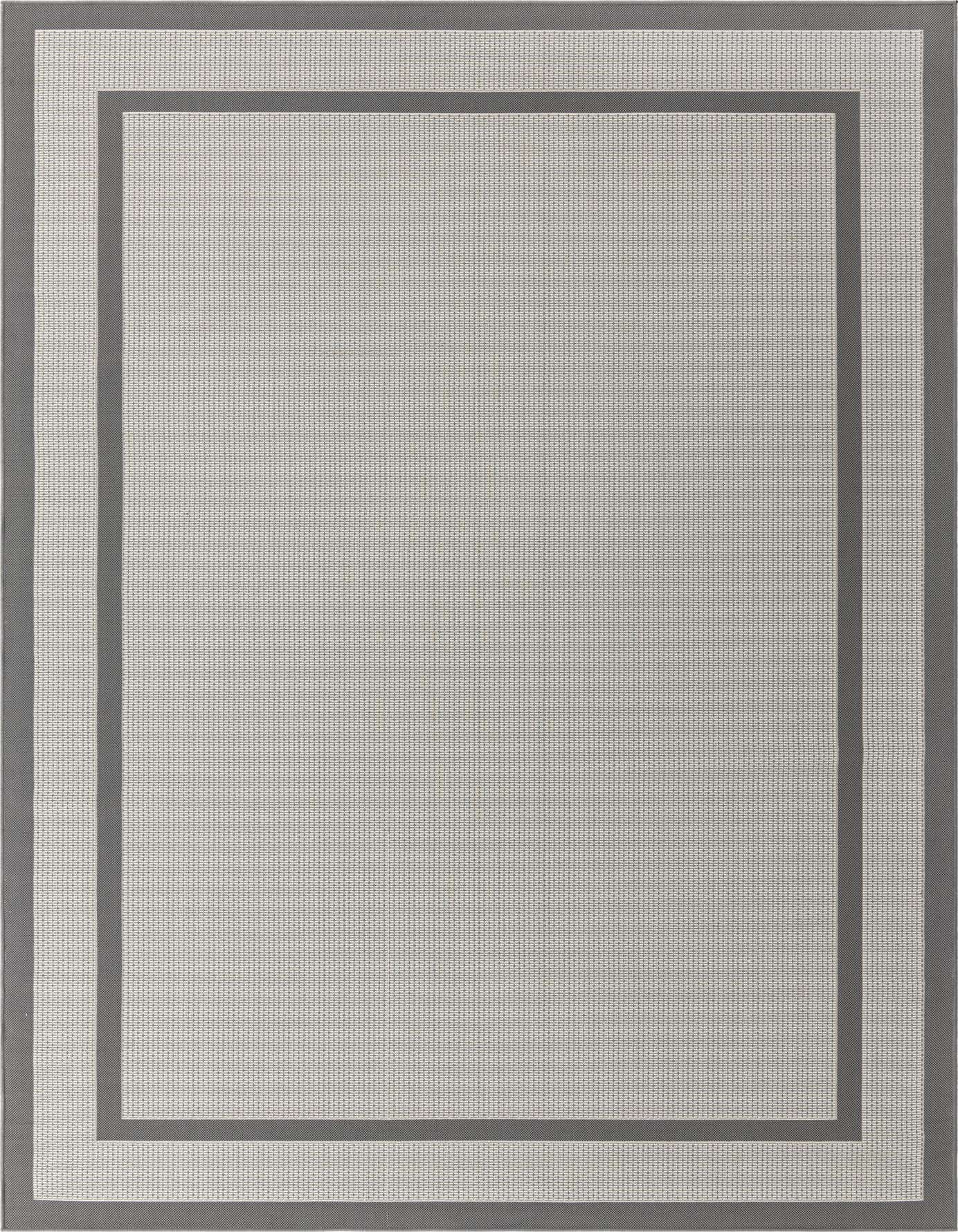 The Outdoor Border Collection presents a versatile and sophisticated 8x11 area rug, machine woven from 100% polypropylene, offering both durability and refined design. This piece features a crisp gray background complemented by a subtle silver border, creating a clean and contemporary look. The rug's flatweave construction contributes to a smooth, low-profile texture, which pairs well with its stain-resistant and pet-friendly properties, ensuring a practical choice for high-traffic areas and homes with pets.