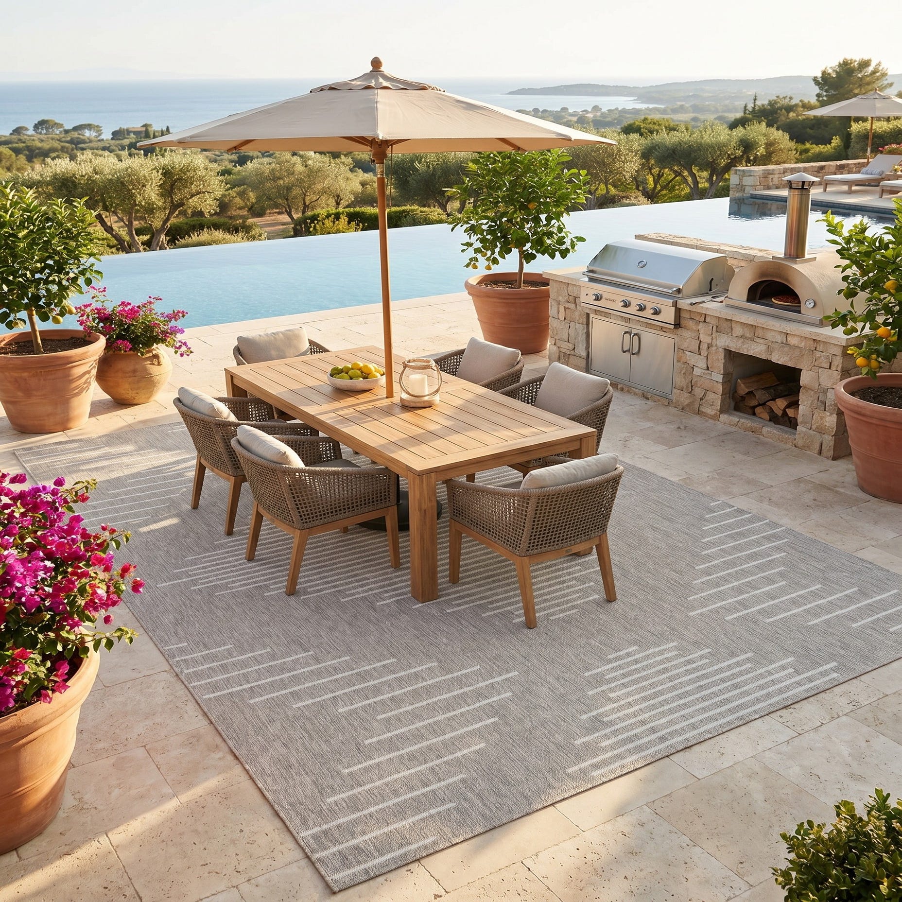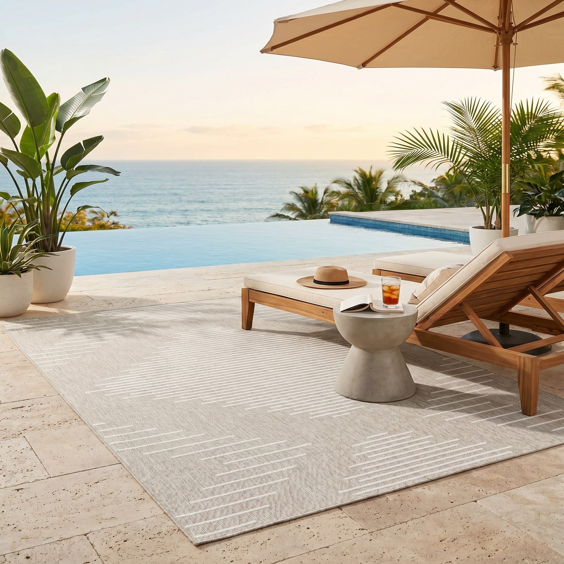 Love the contemporary look of this rug! We are so happy we chose this to accent the blue of our pool with our living area on our lanai. We still are going to add a few more pillows but love the rug to add color.