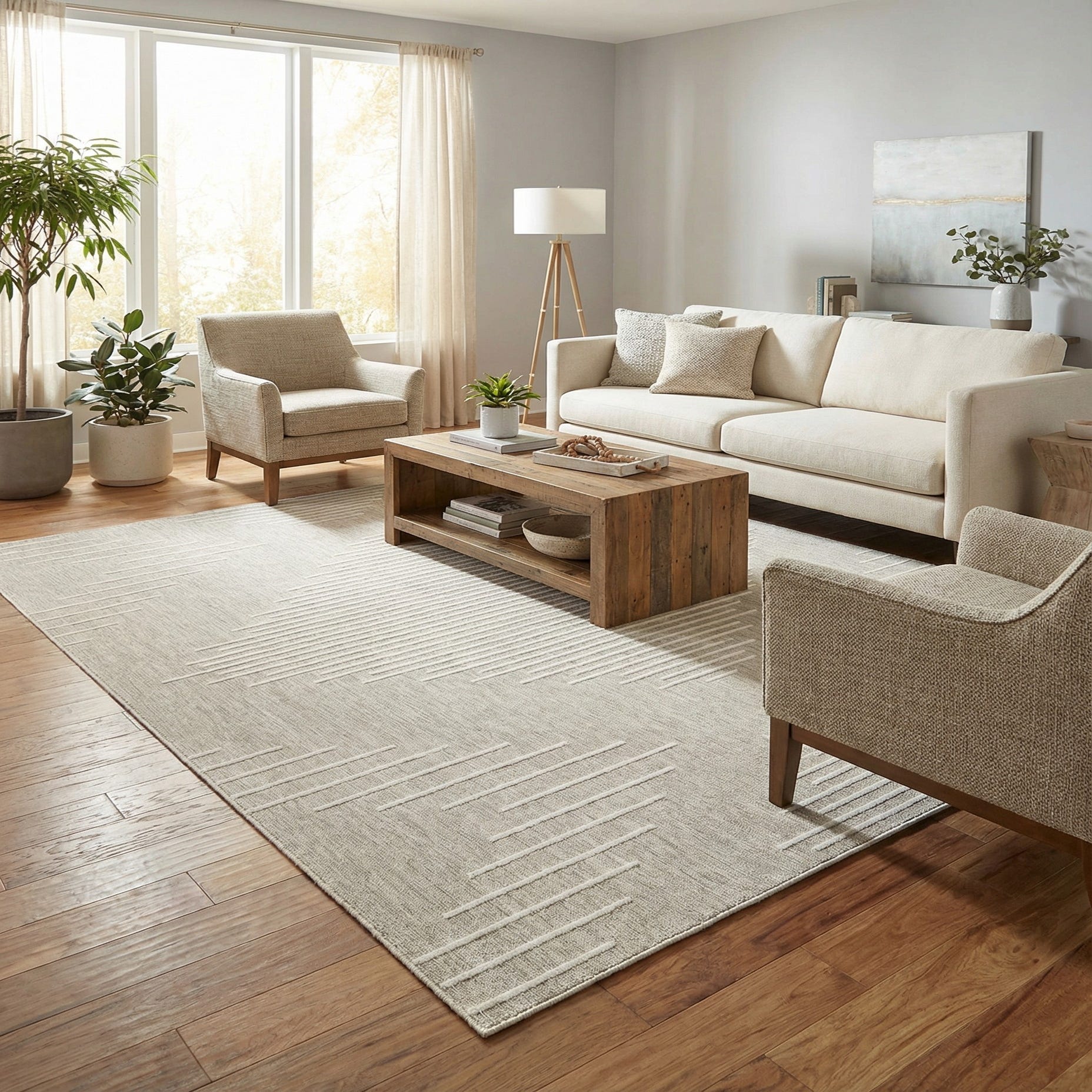 Place this piece on a covered patio or sunroom to define a seating area, use it under an outdoor dining set to maintain a crisp, contemporary look, or bring it inside to a minimalist living room or entry for a subtle graphic anchor. It pairs easily with natural wood tones and woven accessories for a relaxed, Scandinavian or coastal vibe, or with metal and glass accents for a more urban, modern scheme.