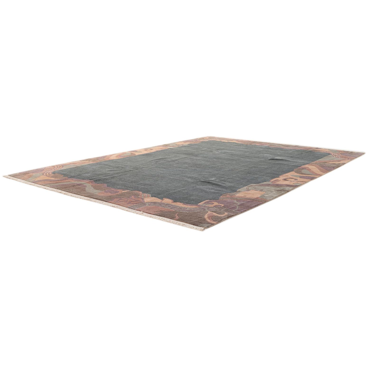 A rectangular 8x11 gray wool rug with a medium pile, featuring an abstract oriental border in earthy tones.