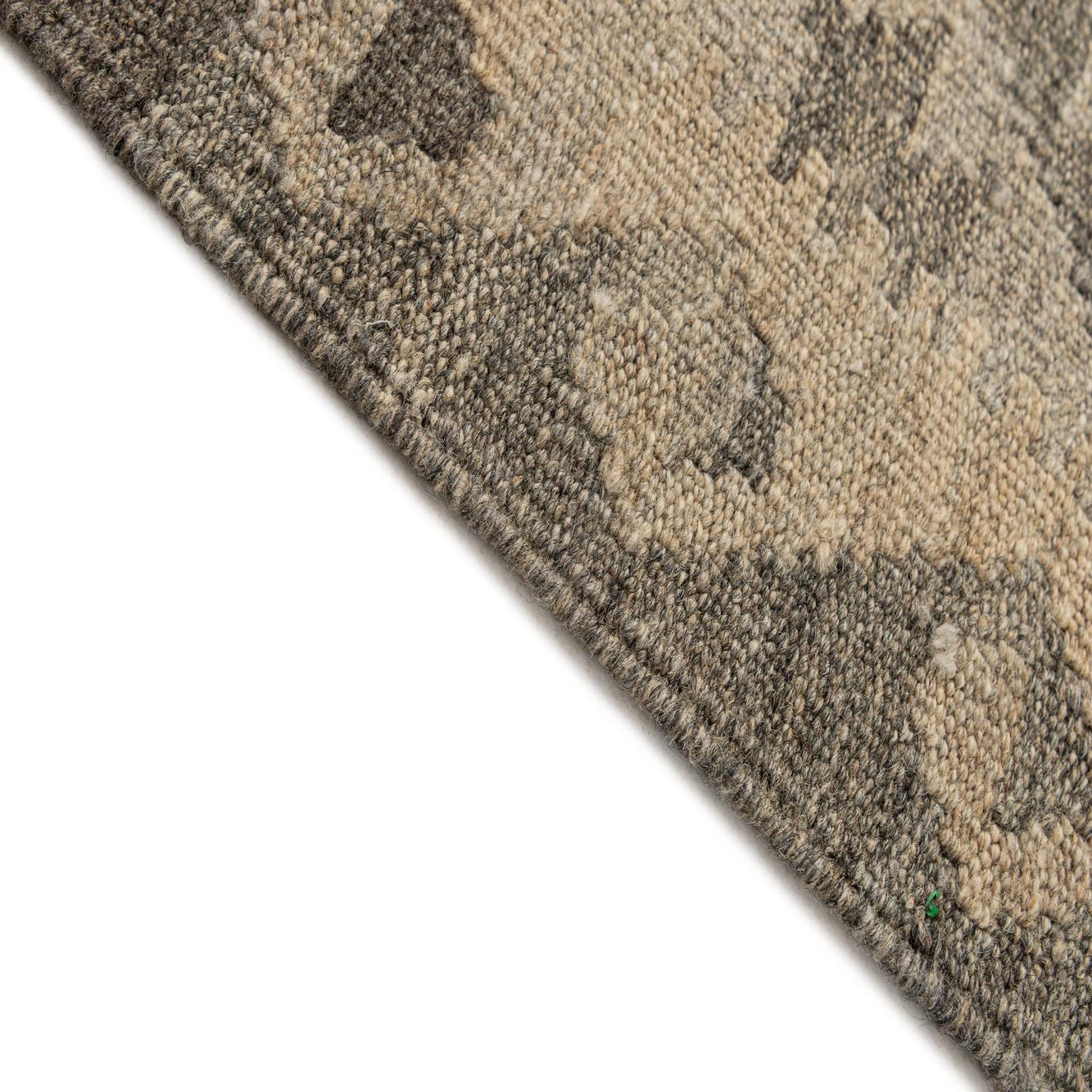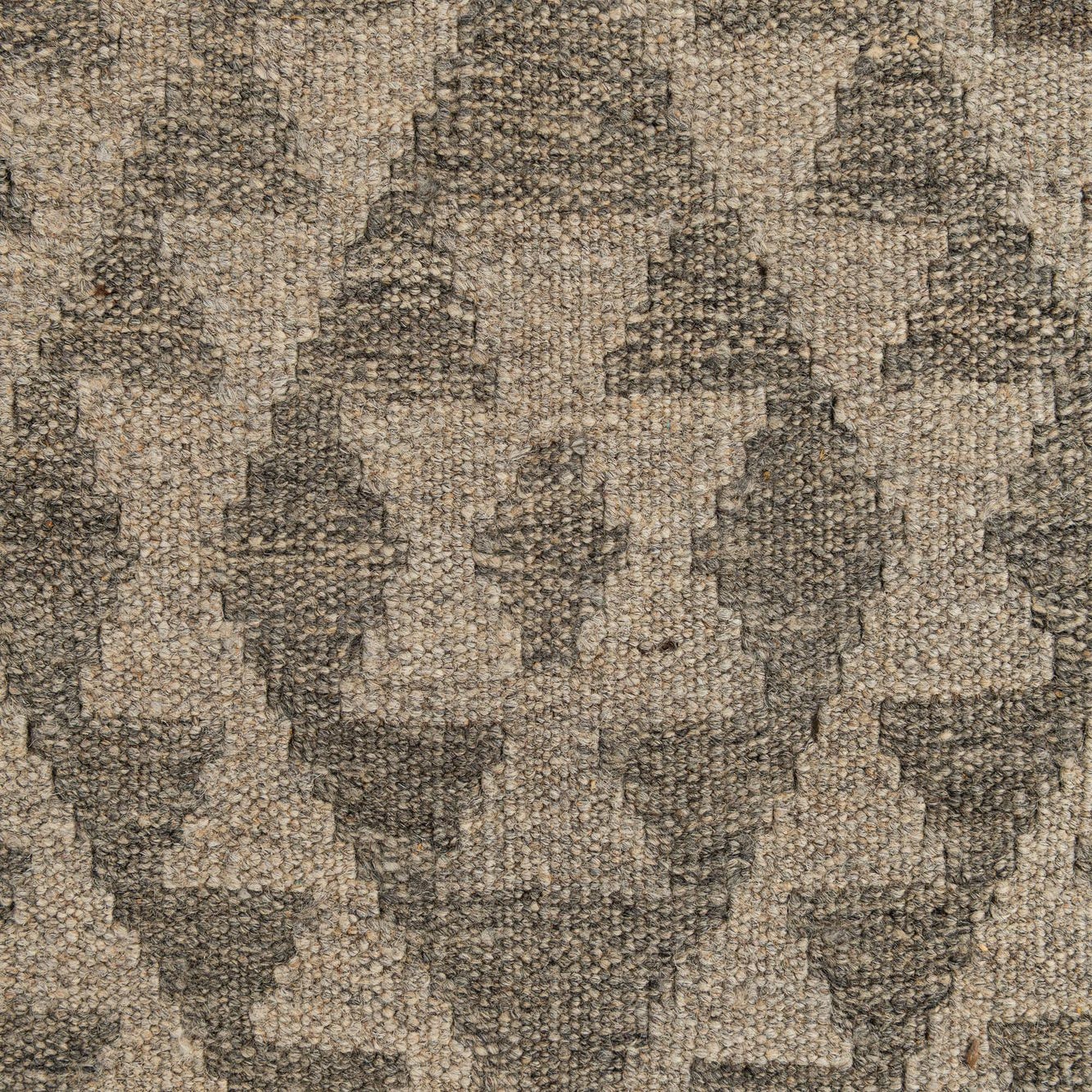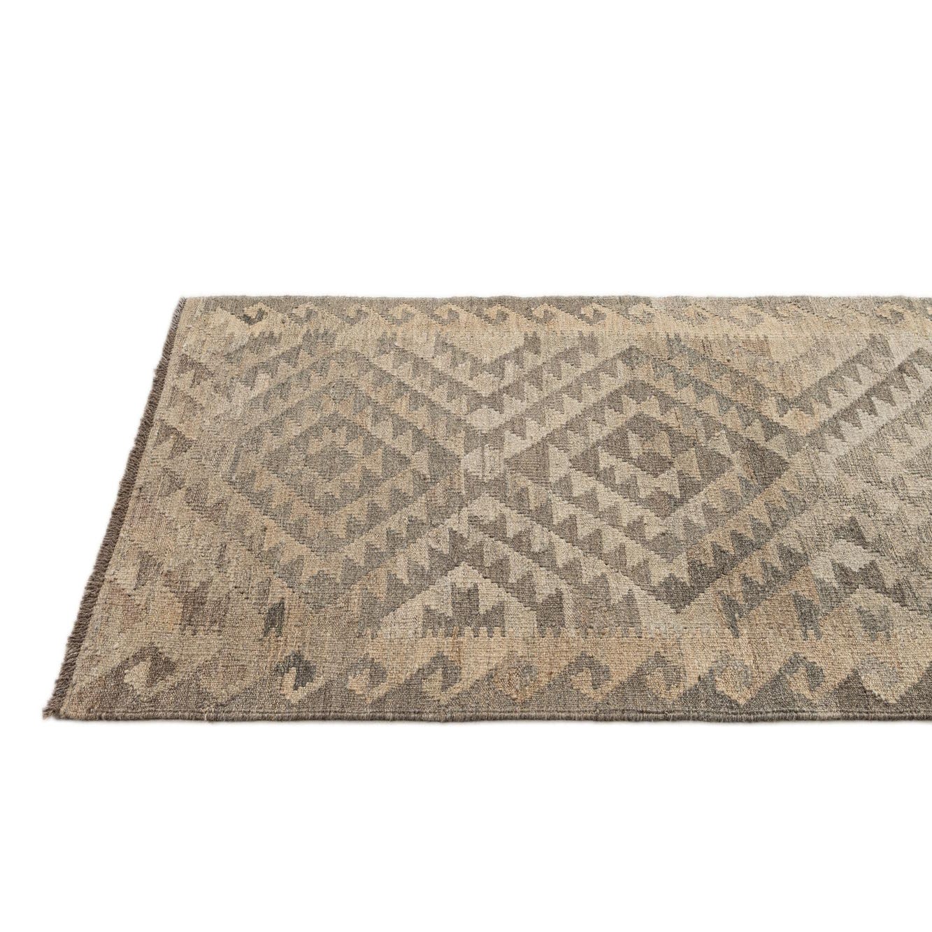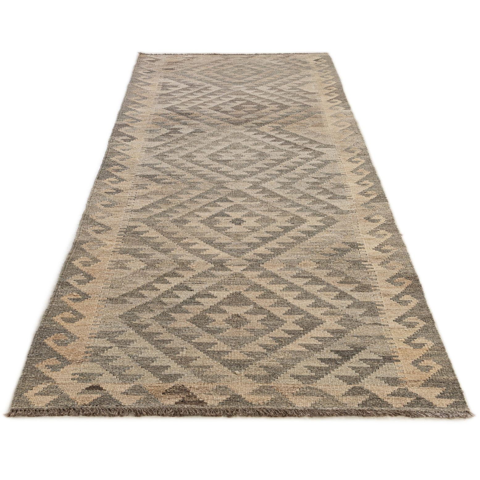 A 9 ft runner rug from the Kilim Maymana collection, featuring a tribal geometric pattern in varying shades of gray and silver.