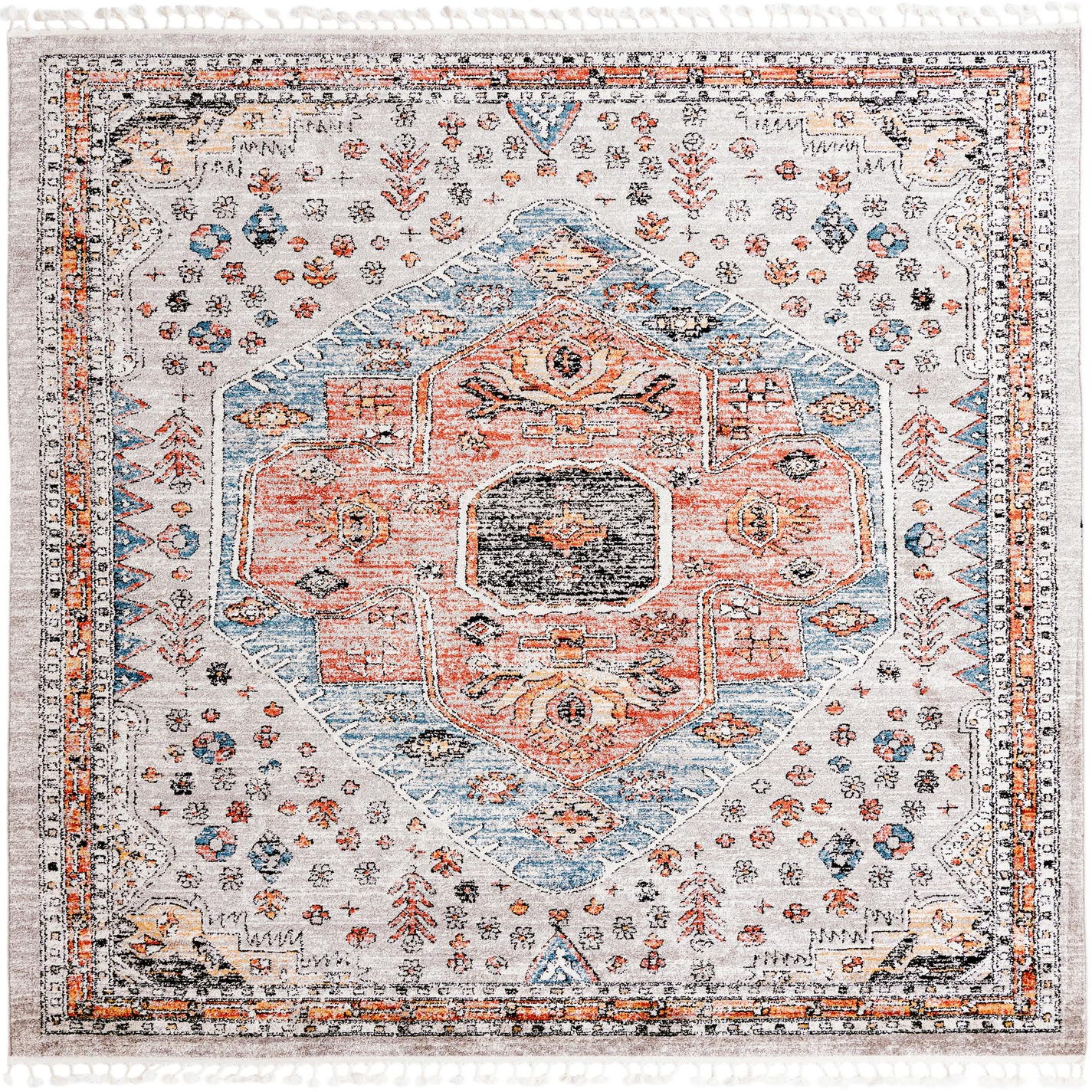 A vintage-inspired medallion anchors a field of delicate floral motifs on a gray ground, creating a balanced, timeworn look. The central motif is rendered in terracotta and red with a washed light-blue surround and ivory accents, while black outlining adds definition to the pattern. A narrow, patterned border and soft fringe at the ends complete the composition. The surface has a low, slightly sheared pile that feels smooth underfoot and carries the distressed coloration with subtle depth, reflecting the machine-made polypropylene construction.