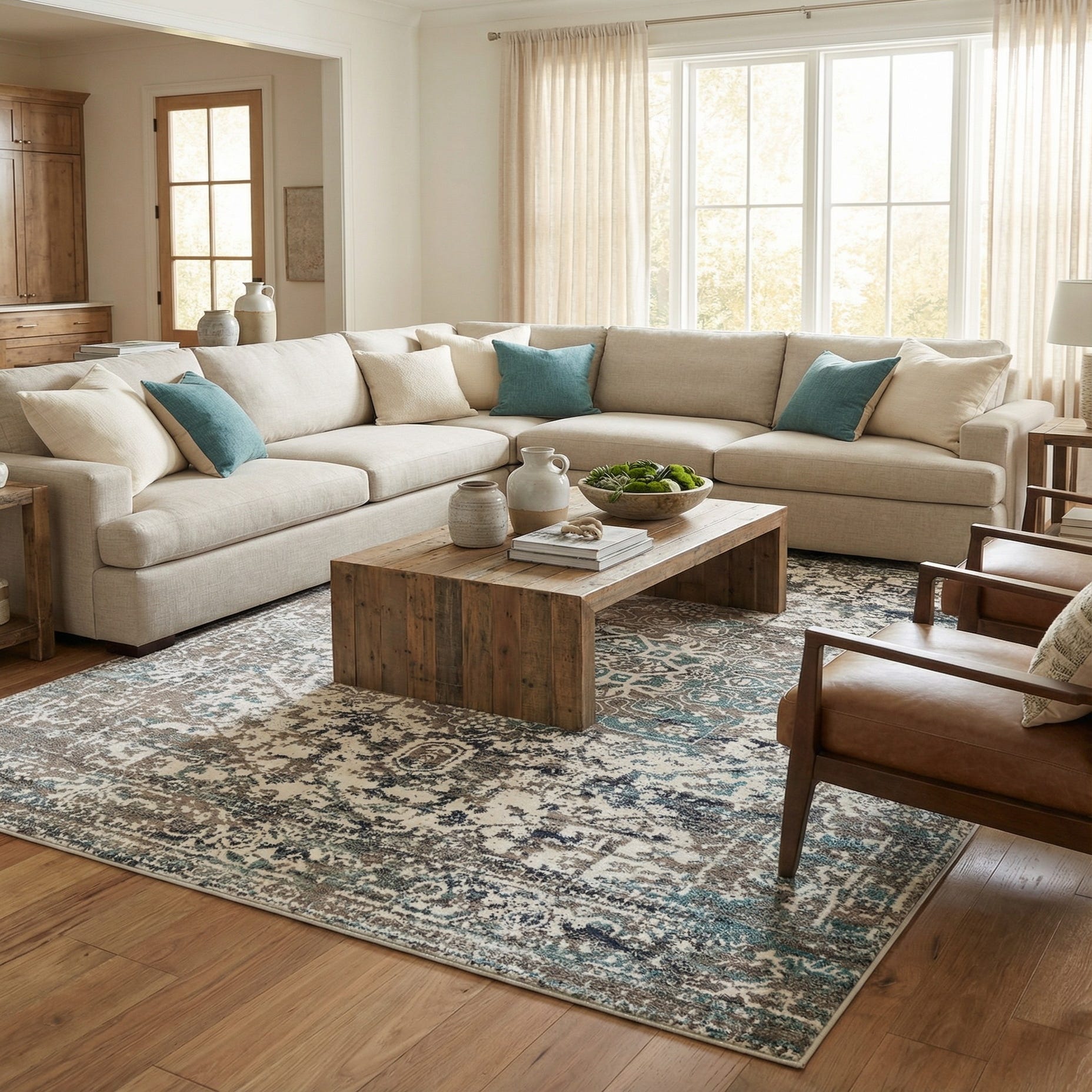 With a medium pile, the rug provides a soft texture underfoot while remaining practical for high-traffic areas. Its gracefully aging design elements make it conducive to a variety of interior design scenarios, including transitional, modern, or classic living rooms, dining spaces, and bedrooms. The cool tones and classic pattern lend themselves well to interiors with a neutral color palette, as well as spaces that use blues or grays as accent colors.