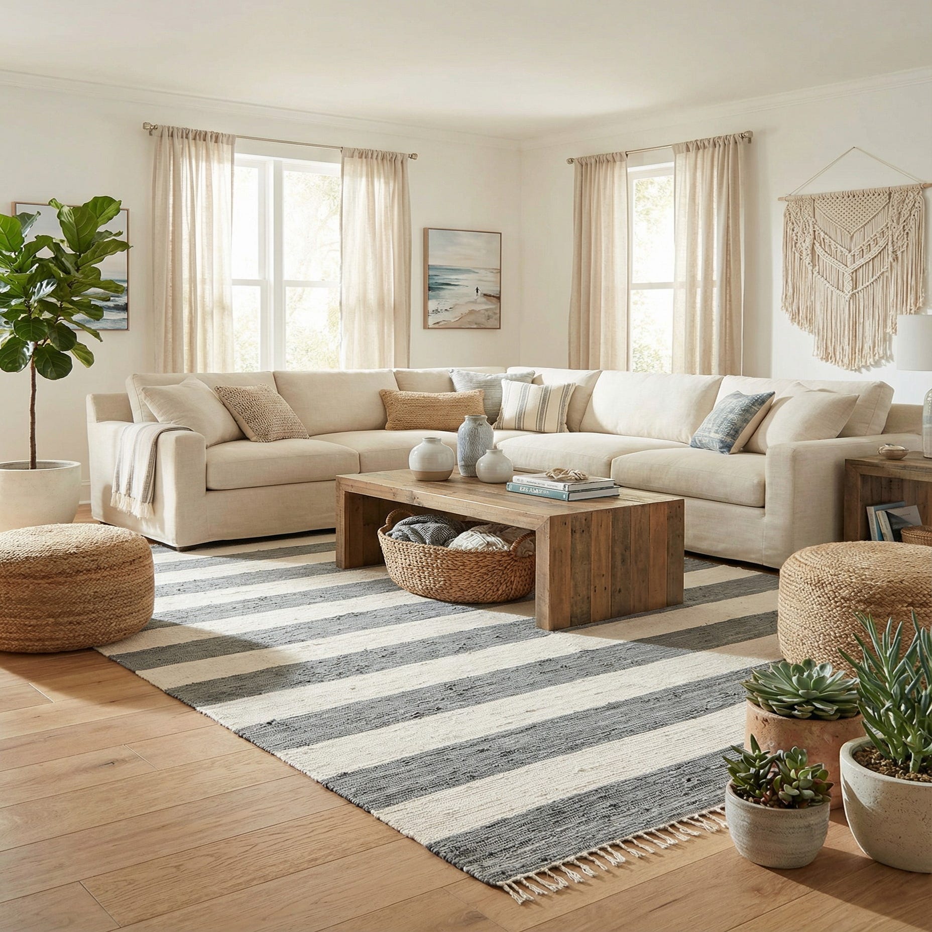 Well-suited to casual and contemporary interiors, this striped rug works nicely under a sofa and coffee table in a living room, beneath a dining table to add linear structure, or as a grounding piece in a bedroom. It pairs with warm wood tones, linen upholstery, leather accents, or white-painted trim, and complements coastal, modern farmhouse, Scandinavian, and relaxed minimalist schemes.