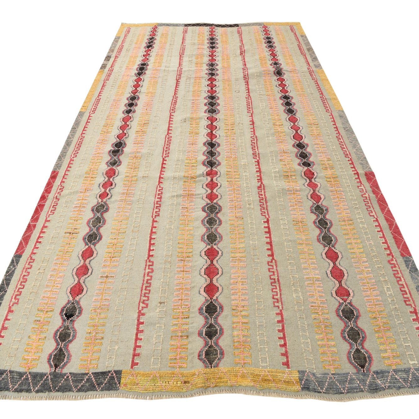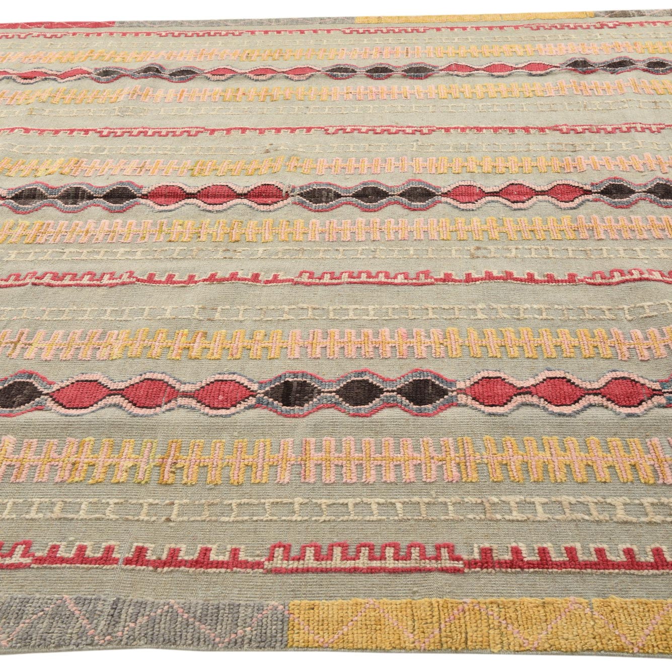 A 9x12 rectangular Darya rug with a modern abstract pattern featuring vertical stripes in gray, pink, yellow, and black.