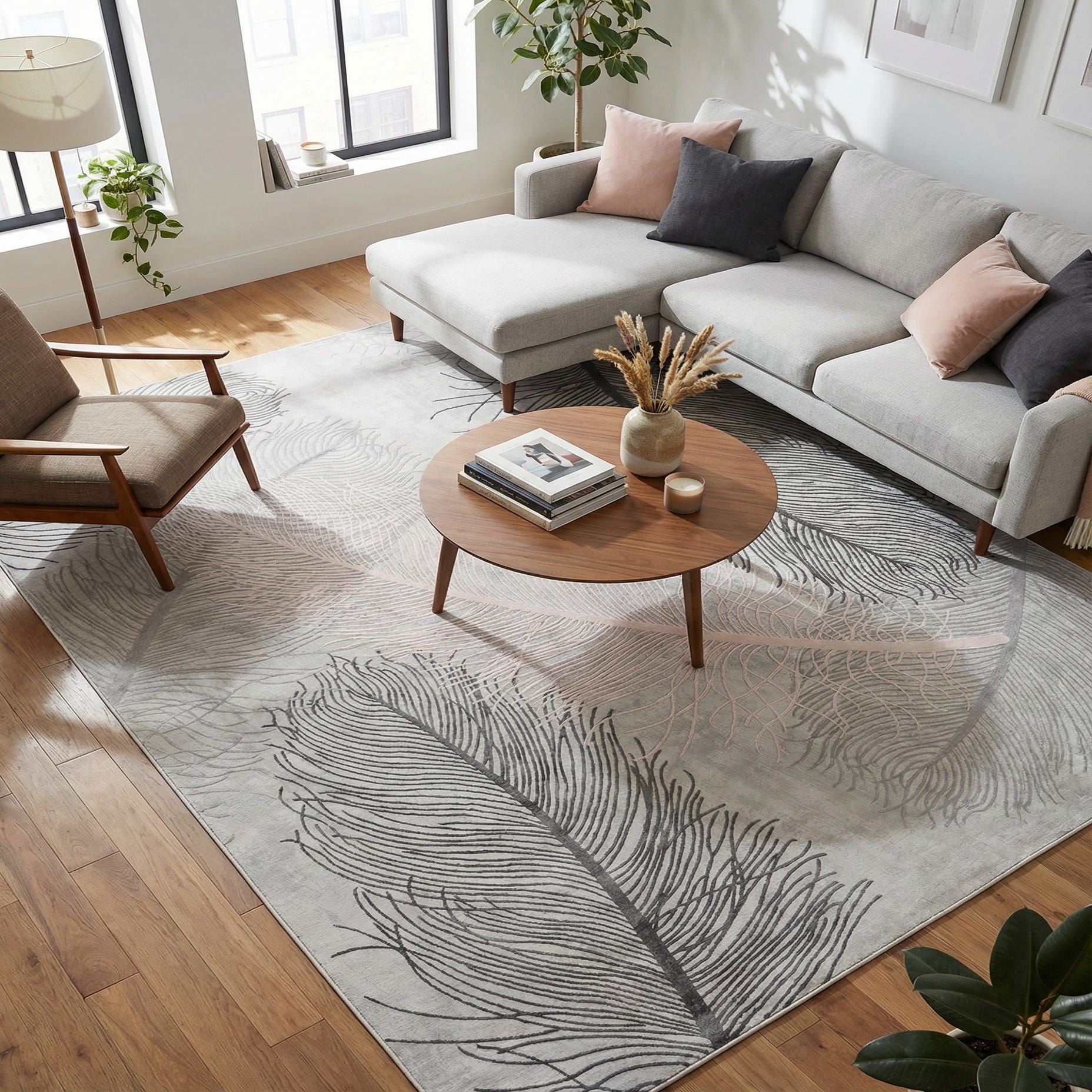 A soft gray background sets the stage for an oversized feather motif rendered in fine, linear strokes of ivory and beige. The overlapping plumes create a feeling of movement while keeping the overall look clean and contemporary; the design reads as modern organic rather than ornate. Machine-made from 60% polypropylene and 40% polyester, the rug has a low, smooth pile with a subtle sheen and a soft hand that invites you to walk across it, while the printed lines maintain clear, delicate detail.