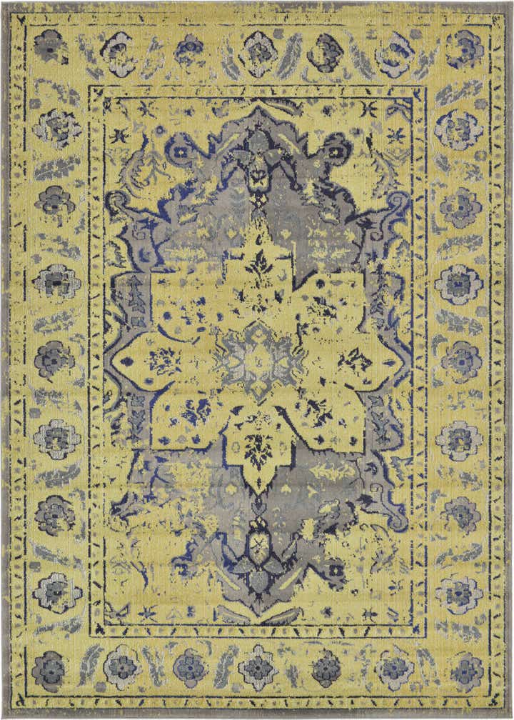 Primary color is Gray. Colors in this rug include: Gray, Gold, Navy Blue, Ivory.