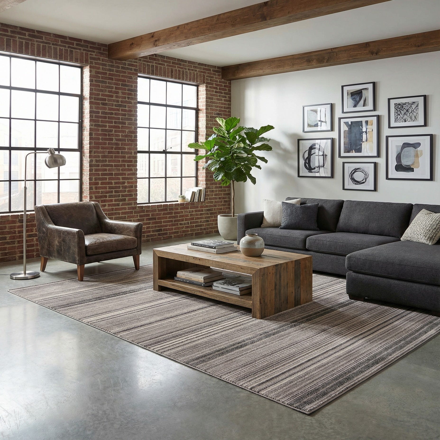 Use this rug as a neutral anchor in a contemporary living room beneath a sofa and coffee table, or place it in a home office to ground a streamlined desk and shelving. It pairs well with warm wood tones and black metal accents, ivory linens and textured throws, and fits naturally into minimalist, mid-century modern, or industrial-inspired interiors where a calm, layered foundation is desired.