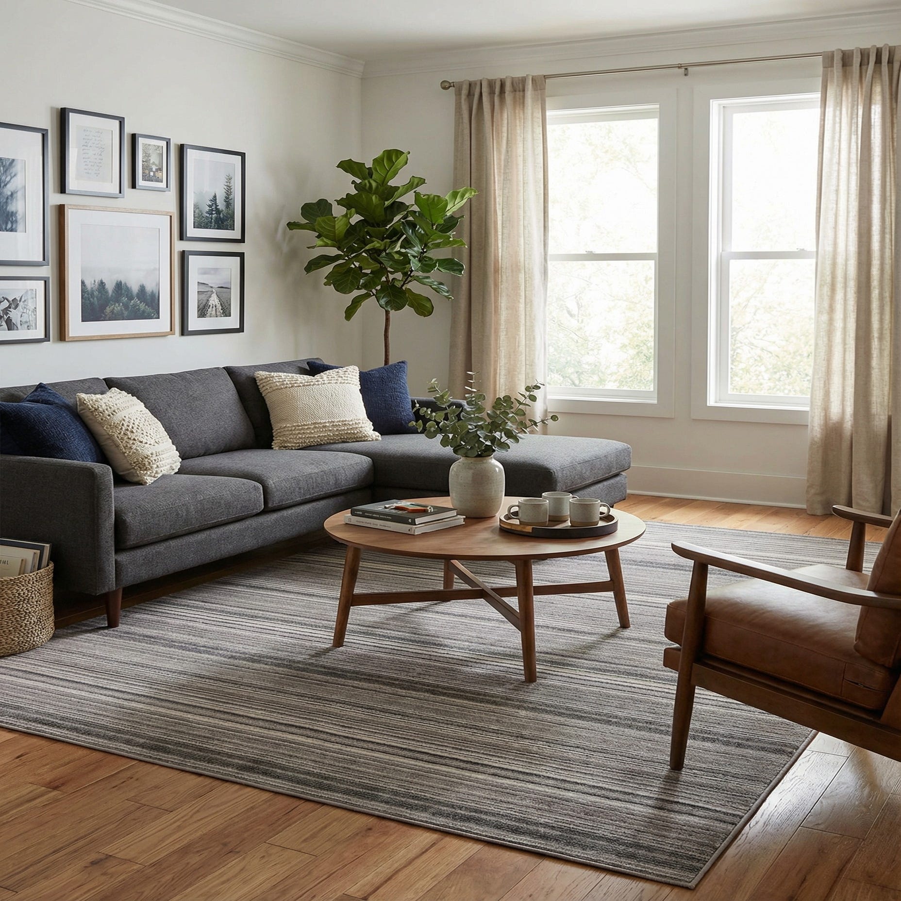 Use this rug as a neutral anchor in a contemporary living room beneath a sofa and coffee table, or place it in a home office to ground a streamlined desk and shelving. It pairs well with warm wood tones and black metal accents, ivory linens and textured throws, and fits naturally into minimalist, mid-century modern, or industrial-inspired interiors where a calm, layered foundation is desired.