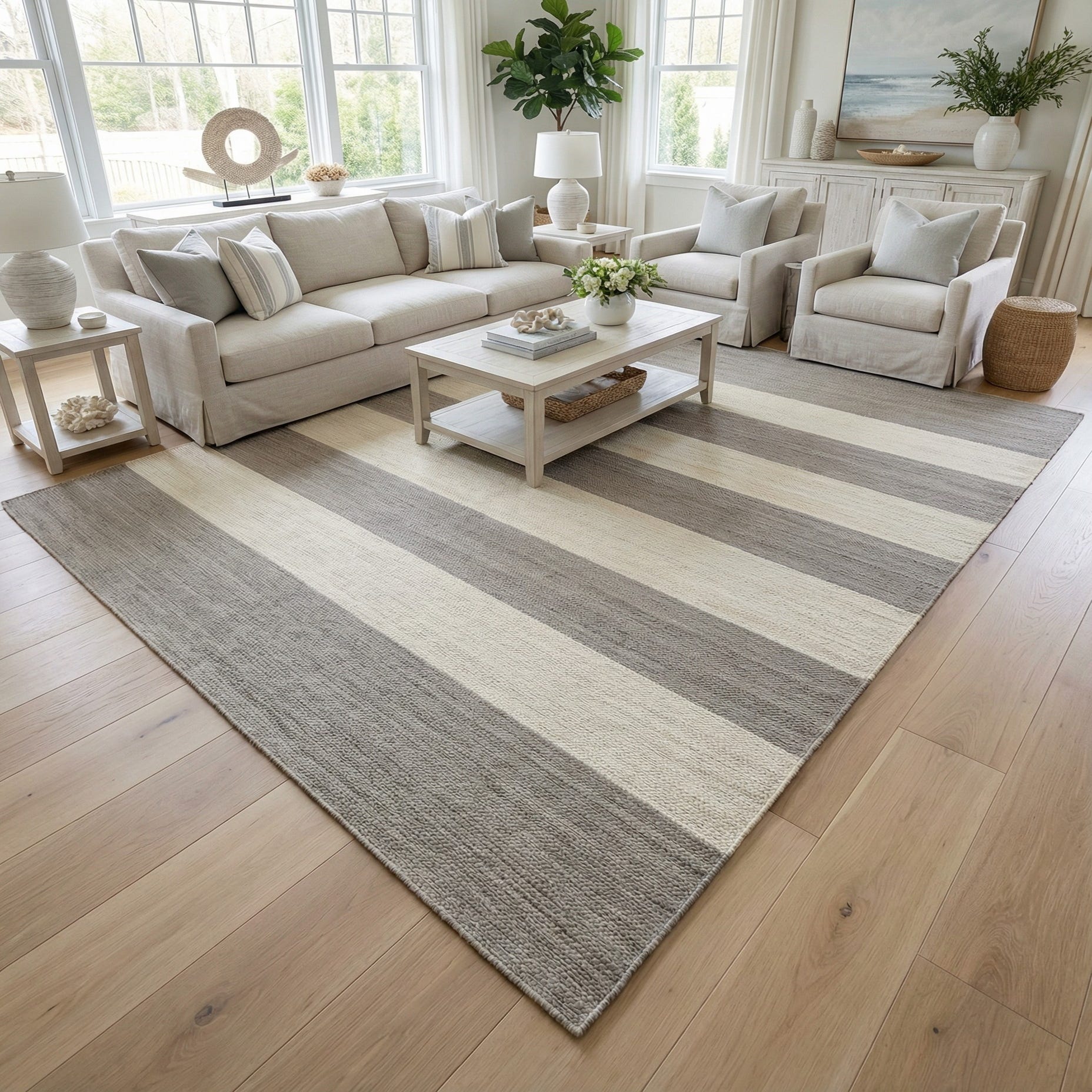 In terms of style, the rug's flatweave construction and the neutral color palette cement its versatility, making it a suitable addition to a variety of interior design schemes. Whether it's anchoring a minimalist living room, complementing a contemporary Scandinavian-inspired setting, or adding organic texture to a coastal retreat, this piece adapts effortlessly. The clean lines and earth tones could also work well in modern farmhouse decor or serve as a grounding element in a more eclectic room.