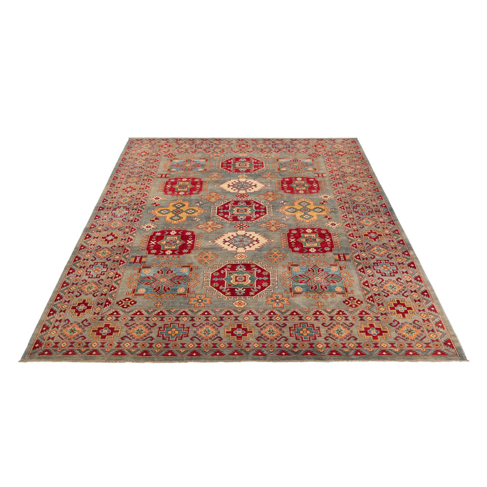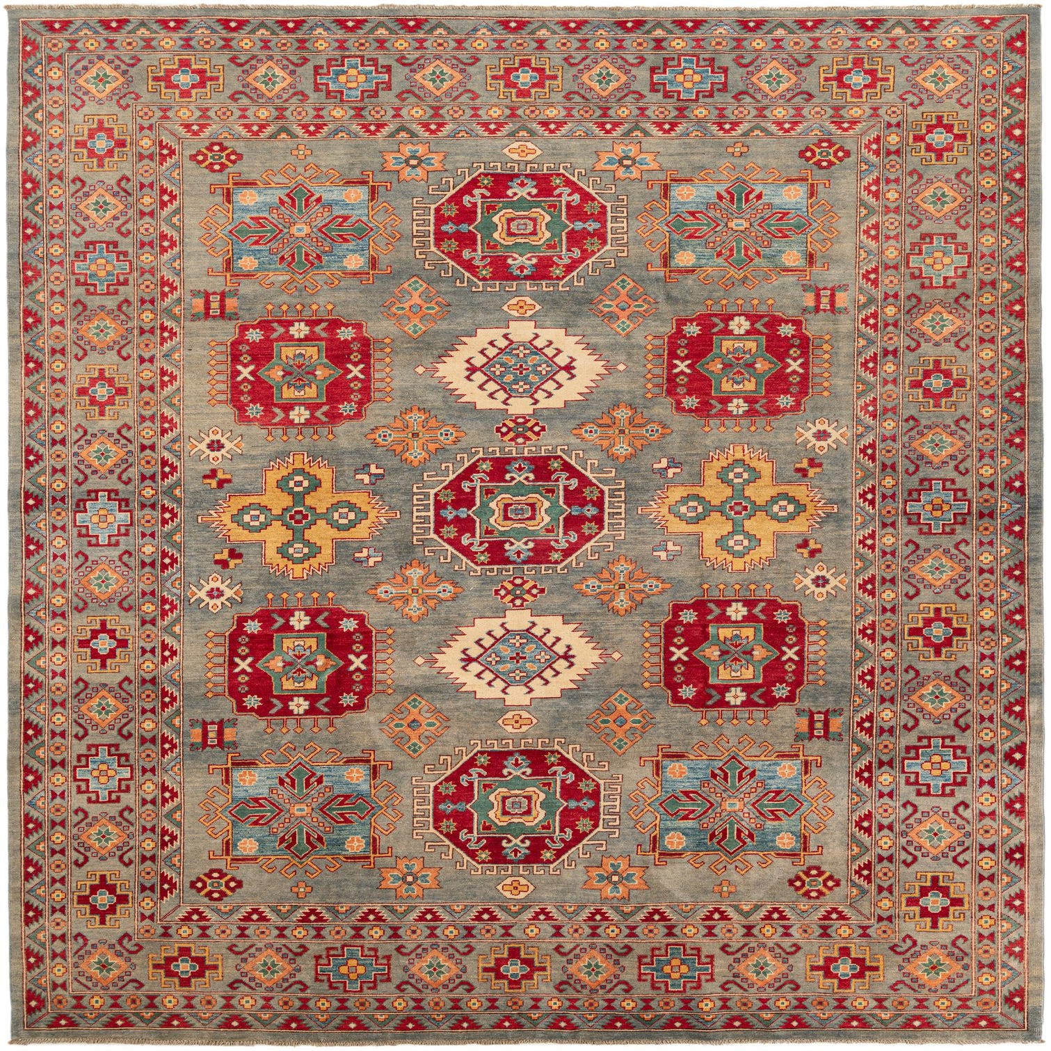 A 9x12 rectangular gray Kazak rug with a vibrant modern oriental pattern featuring red, blue, and yellow geometric motifs.