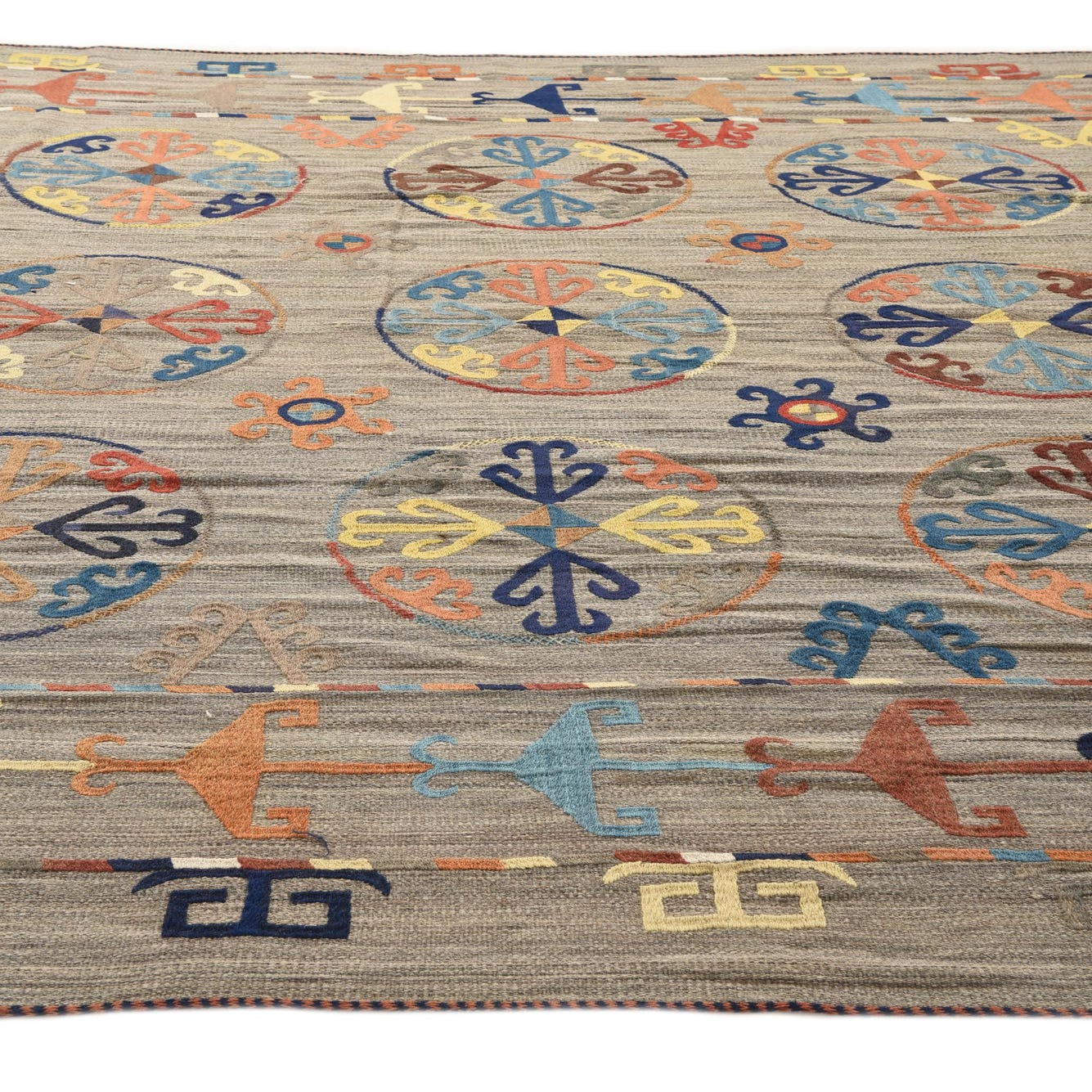 The Kilim Modern collection presents a hand-woven 9x12 rug composed of 100% wool, offering a refined touch to any space with its unique texture and quality craftsmanship. The background color is a versatile gray, supporting an intricate pattern featuring a blend of colors such as blue, brown, ivory, orange, rust red, yellow, beige, light blue, and light brown. This rich palette creates a harmonious balance and an appealing visual interest that is both modern and timeless.