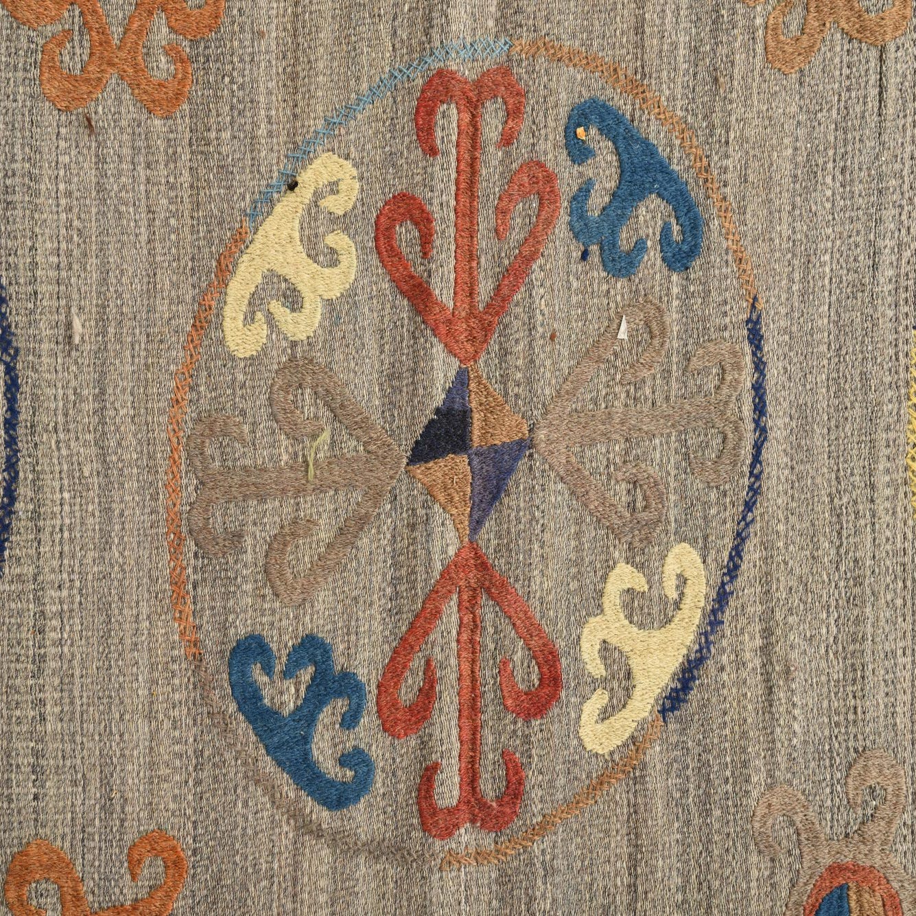 The rug's design showcases a series of ornamental medallions, accented with geometric motifs and tribal-inspired symbols, providing a contemporary twist on traditional kilim patterns. The flatweave construction of the rug adds to its durability and ease of placement in high-traffic areas.