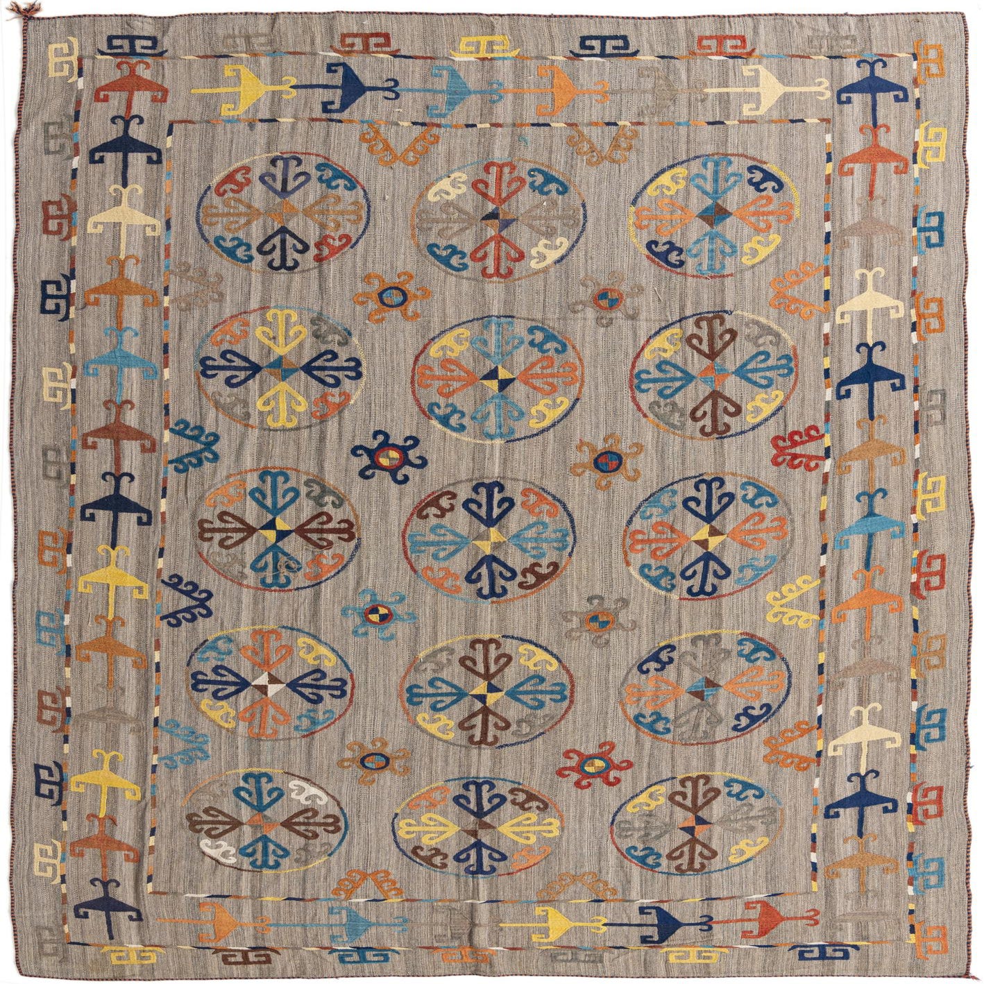 A 9x12 rectangular gray flatweave wool rug with colorful tribal medallions and abstract border patterns, perfect for a modern living room.