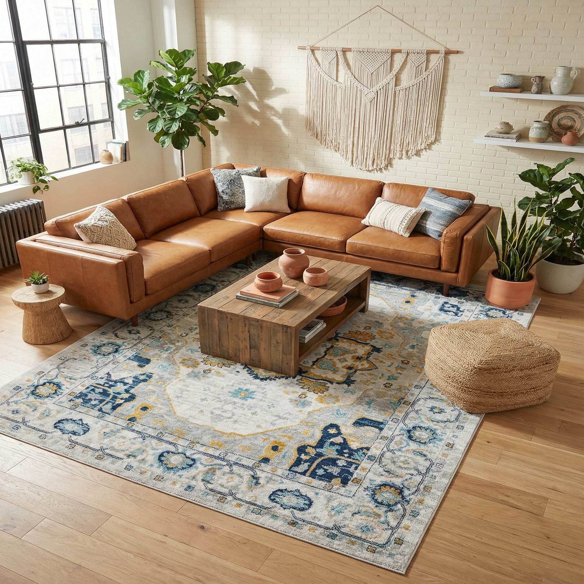 Machine-made from 100% polypropylene, the rug has a low, dense pile that feels smooth underfoot and lays flat in a seating area. It works well beneath a sofa and coffee table to define a living room, under a dining table to introduce pattern without competing with chairs, or layered in a bedroom for a soft visual anchor. The gray and ivory base with light blue and yellow accents pairs easily with neutral, coastal, or transitional interiors and complements both light-wood and darker-stained furniture.