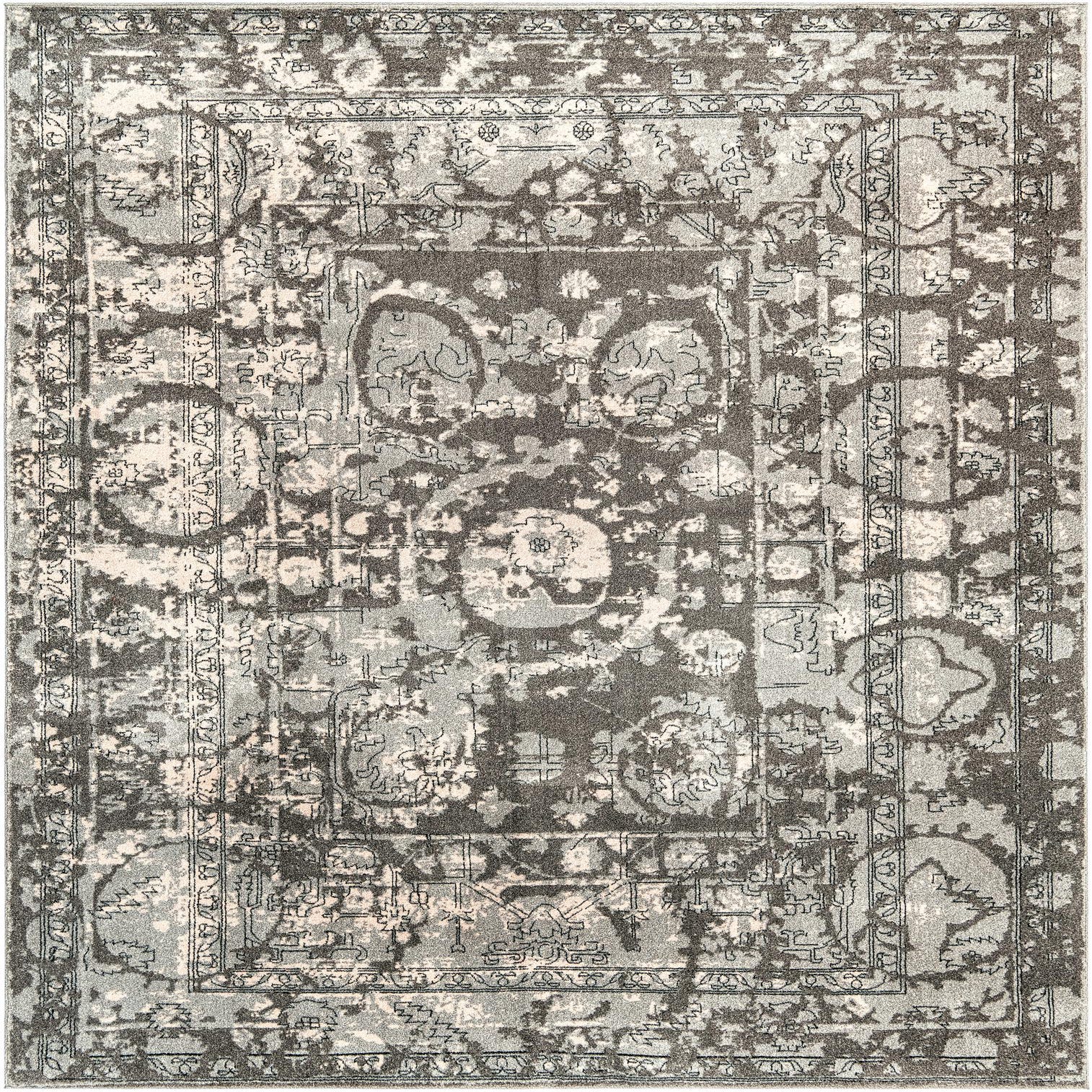A soft, low-profile rug with a gray background and an antique-inspired pattern, this piece balances traditional motifs with a relaxed, distressed finish. Classic medallions and floral elements sit within a faintly ornate border, while silver highlights and ivory accents create subtle contrast and a gentle, layered look. The overall effect is refined without being formal, offering visual depth through its worn, vintage character.