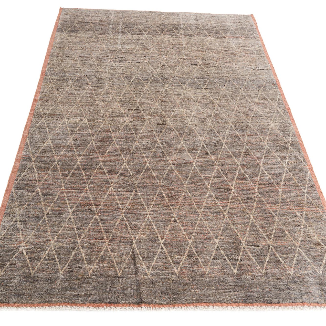 This Moroccan collection rug is a hand-knotted piece, measuring a spacious 9x12, crafted from 100% wool, which offers both durability and a soft underfoot texture. The design features a grid of diamond motifs, rendered in a subtle blend of colors that include gray, beige, brown, pink, and light brown. The background color is predominantly gray, providing a neutral base that allows for the geometric pattern and the gentle variations in hue to come to the fore.