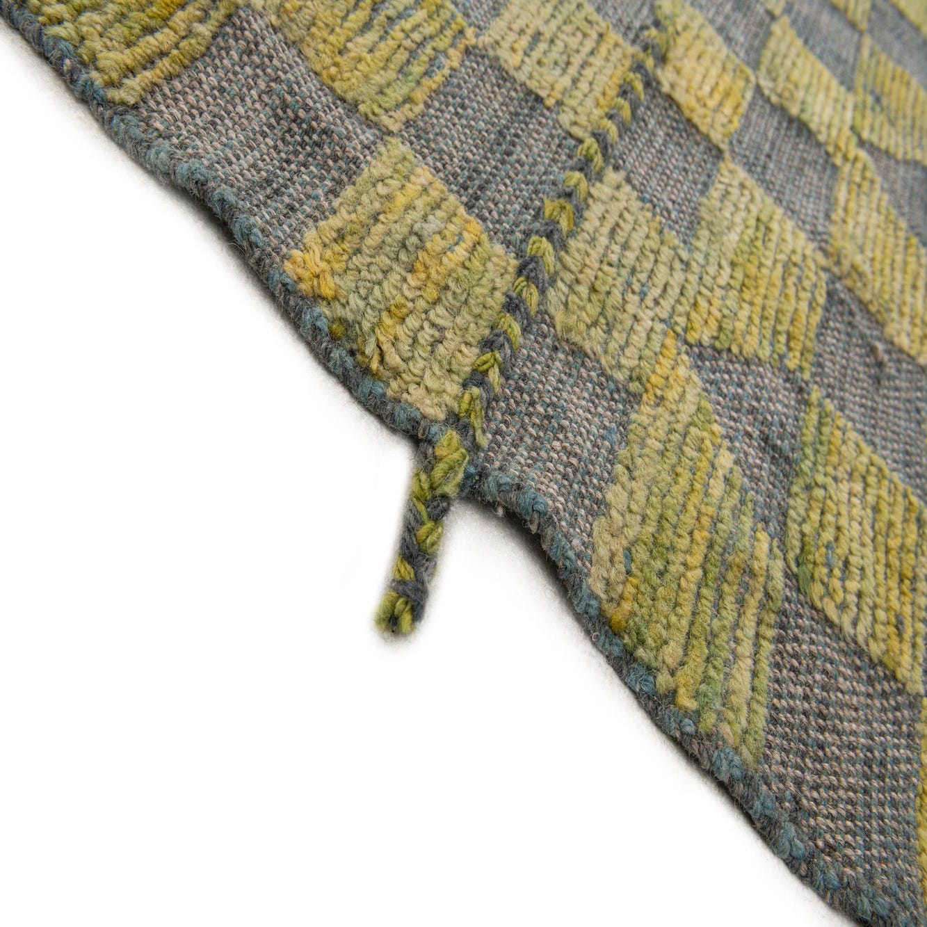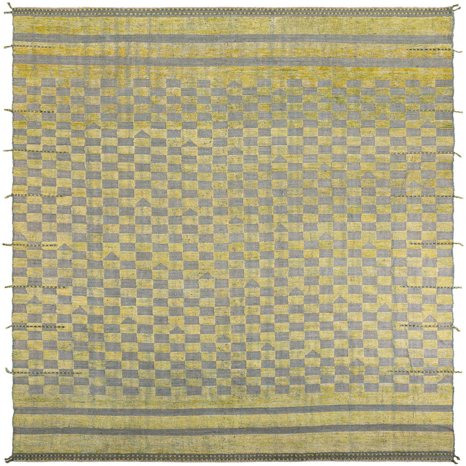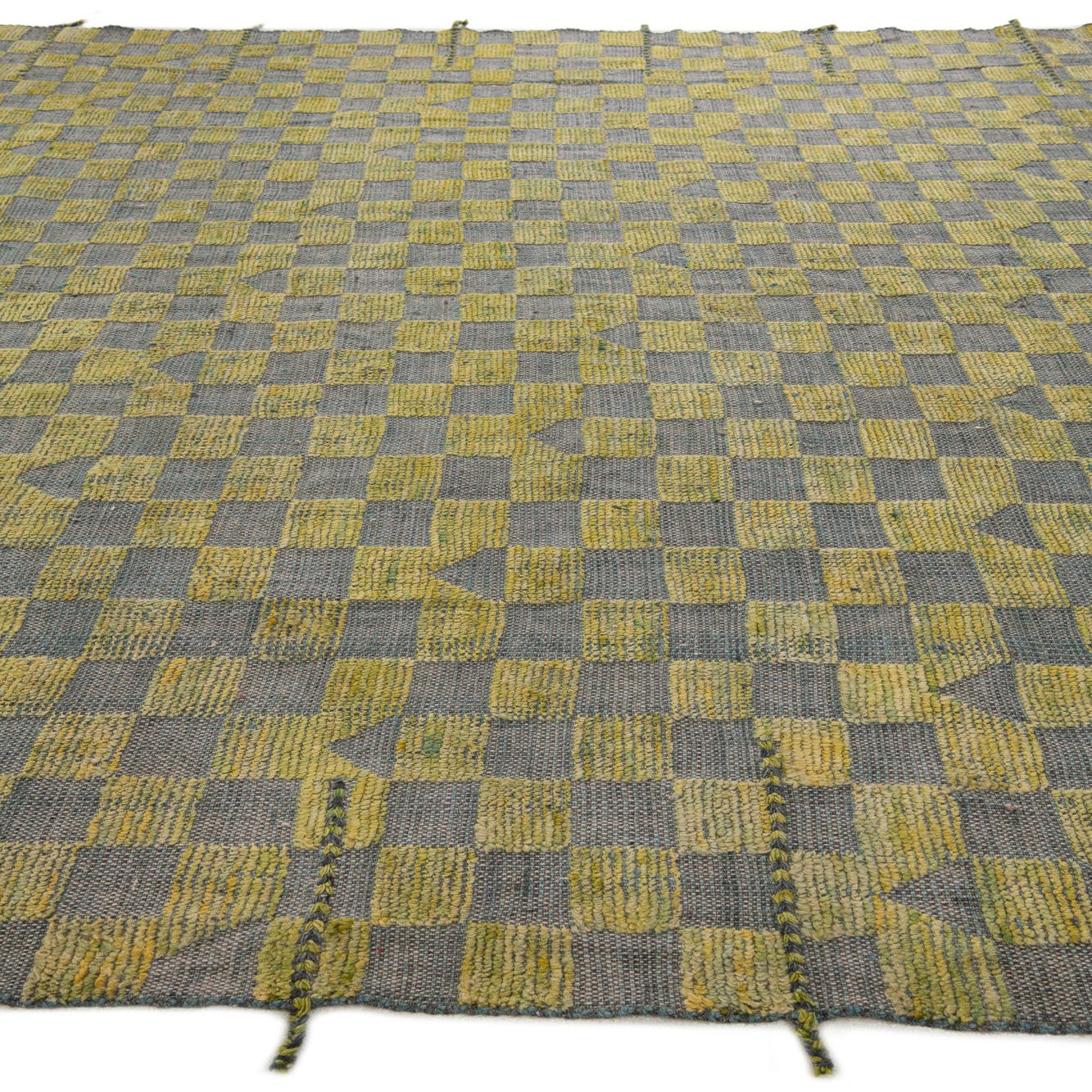 A 9x12 rectangular gray and yellow tribal rug with a checkered pattern and subtle geometric accents, ideal for a living room.