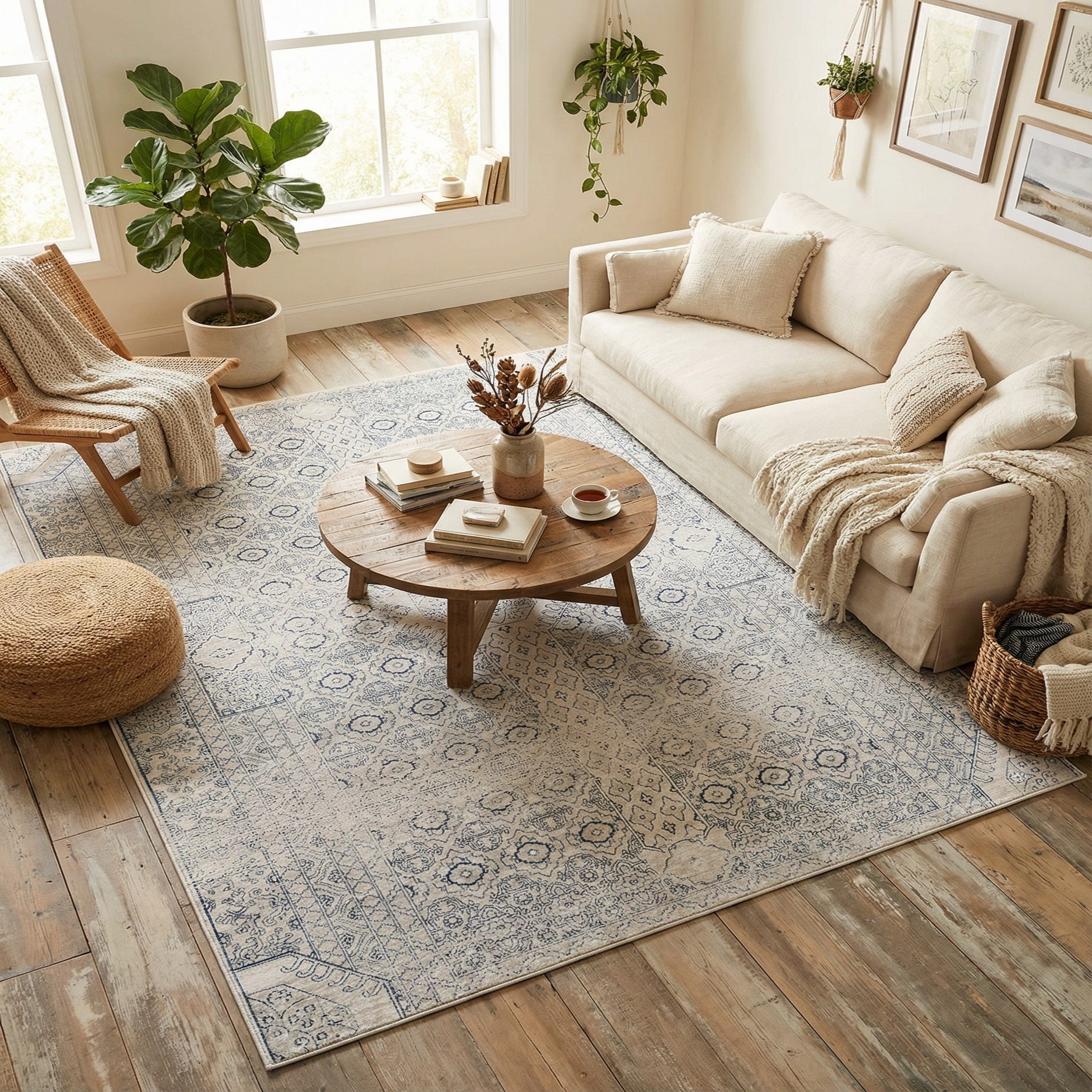 This rug works well in a range of interiors — it anchors a neutral living room with light wood or painted furniture, layers confidently beneath a dining table, or softens a bedroom with pale linens and linen draperies. Its transitional styling pairs easily with coastal, modern farmhouse, or Scandinavian-inspired schemes, and the muted gray-and-ivory palette adds quiet sophistication without overwhelming the room.