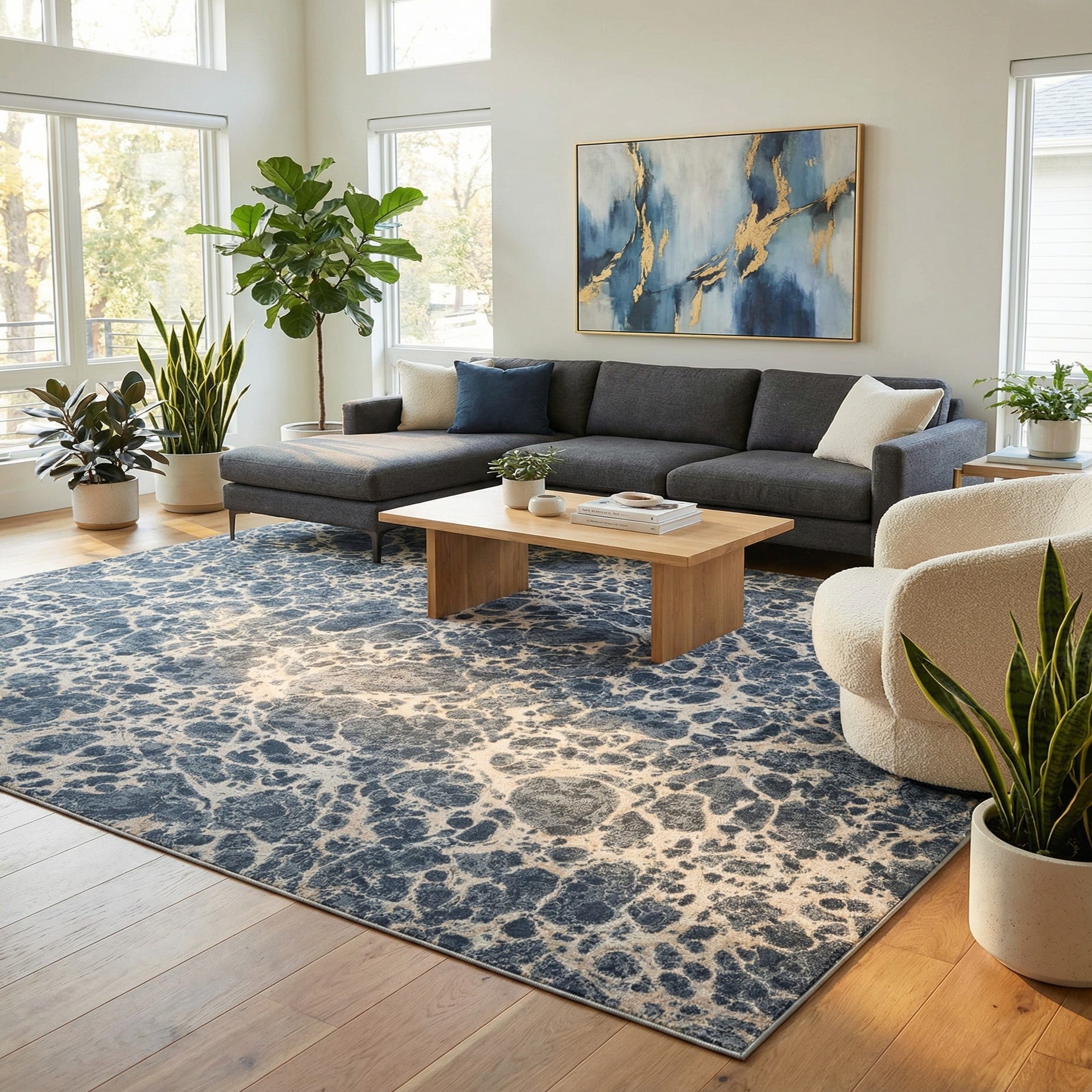 Machine made of 65% polypropylene and 35% polyester, the rug has a low-profile, dense weave that feels smooth underfoot with subtle textural variation where the lighter tones define the pattern. It works well as an anchor for a modern living room under a sofa and coffee table, a layered addition in a bedroom, or a grounding piece beneath a dining table. Pair it with warm wood furniture, brushed metal accents, or soft linens to emphasize the rug’s mix of contemporary texture and calming color.