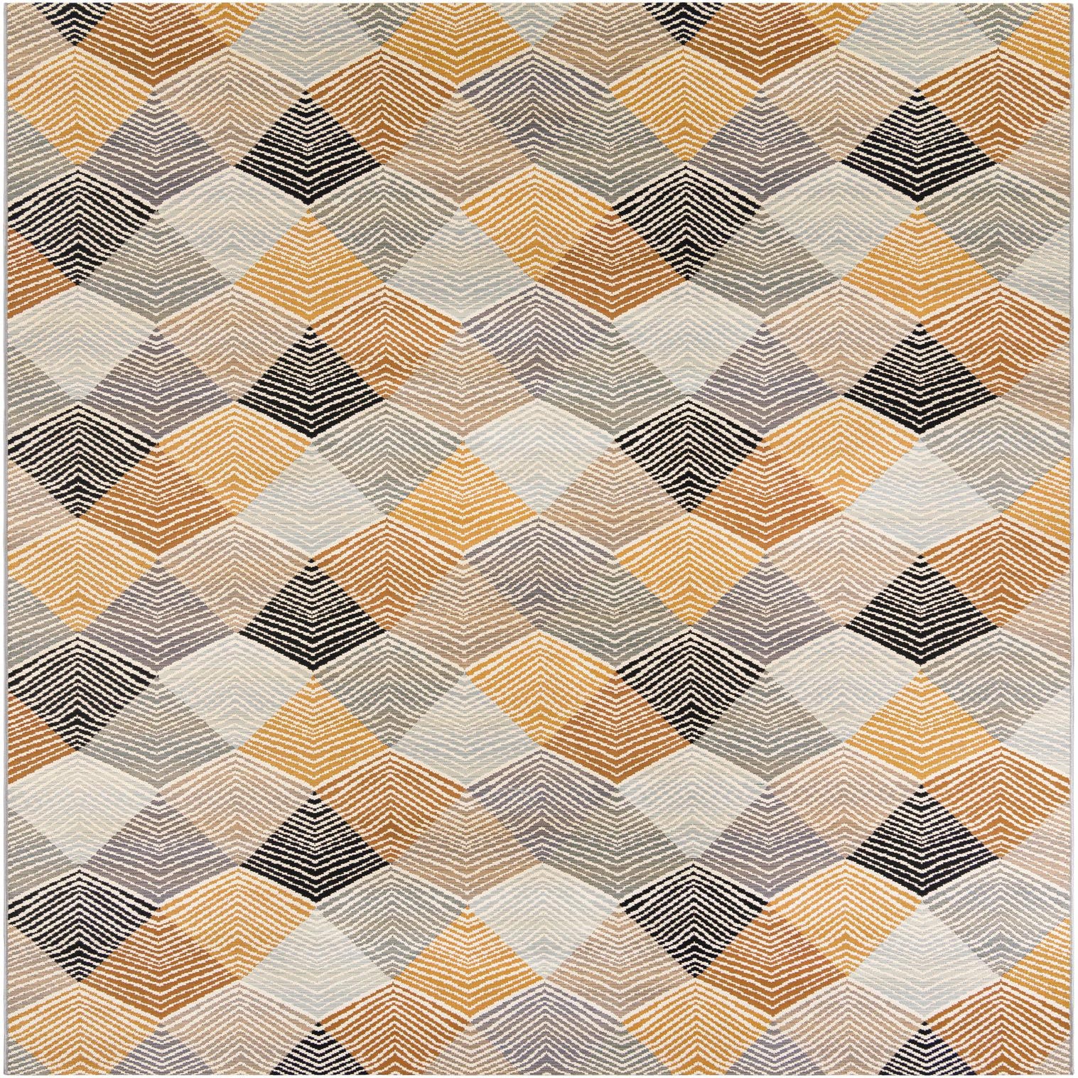 A bold geometric pattern of overlapping diamond motifs sits on a gray ground, each shape filled with fine chevron lines that create a sense of movement and layered depth. Color blocks of gold, ivory, light blue, black and varying grays alternate across the field, giving the design a modern, graphic feel without overwhelming the eye. The machine-made construction in 100% polypropylene produces a low-pile, tightly woven surface with subtle texture from the linear pattern that feels resilient and pleasant underfoot.