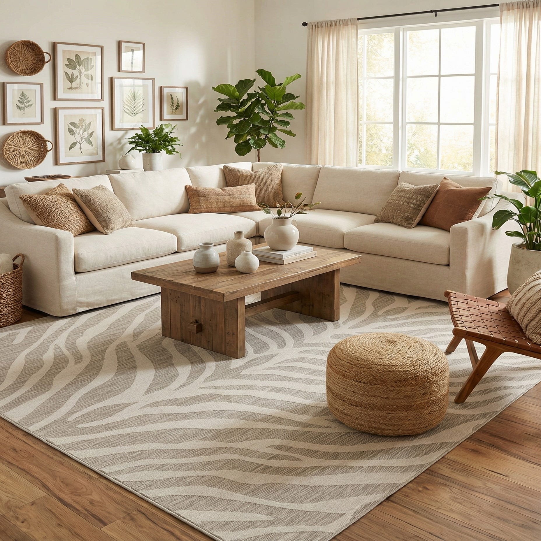 This piece pairs well with neutral, contemporary interiors as well as more layered, natural schemes — try it under a minimalist sofa to add pattern without overwhelming the palette, or on a covered patio alongside rattan seating and greenery for a relaxed outdoor living feel. It also works nicely beneath a dining table with clean lines or layered at the foot of a bed to introduce pattern and soft contrast to hardwood or stone floors.