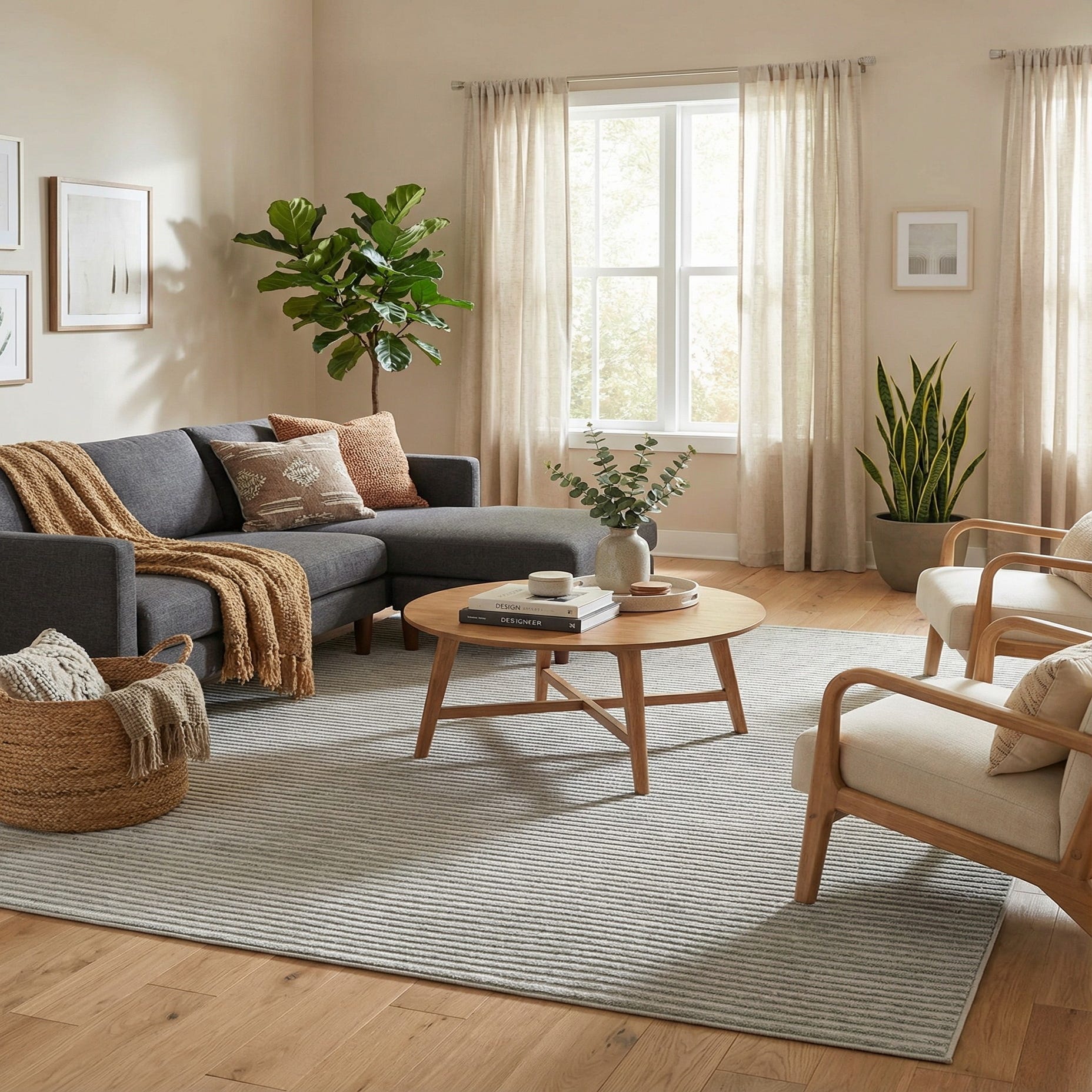 A 9x12 rectangular gray modern indoor/outdoor rug with a subtle striped texture, ideal for a patio or living room.