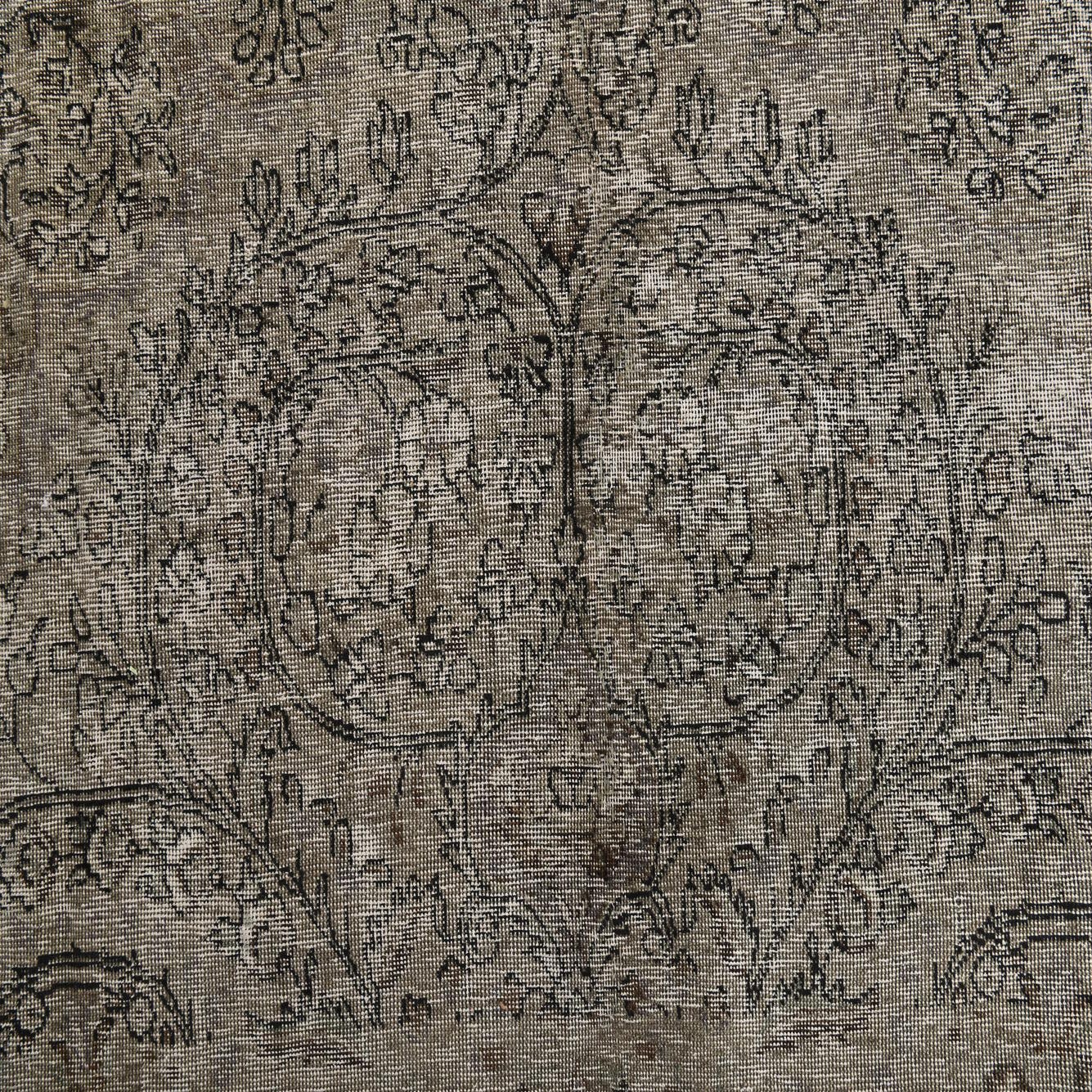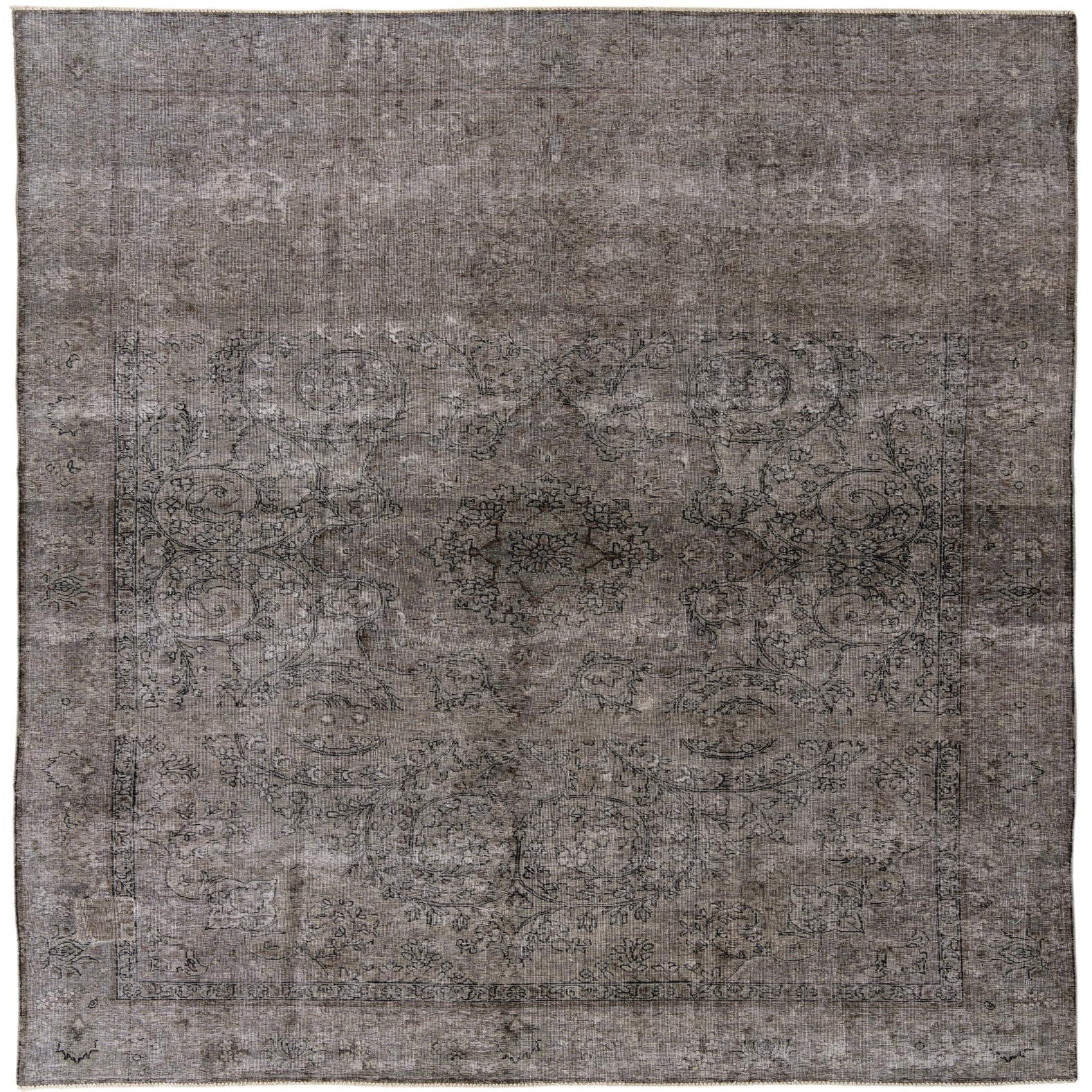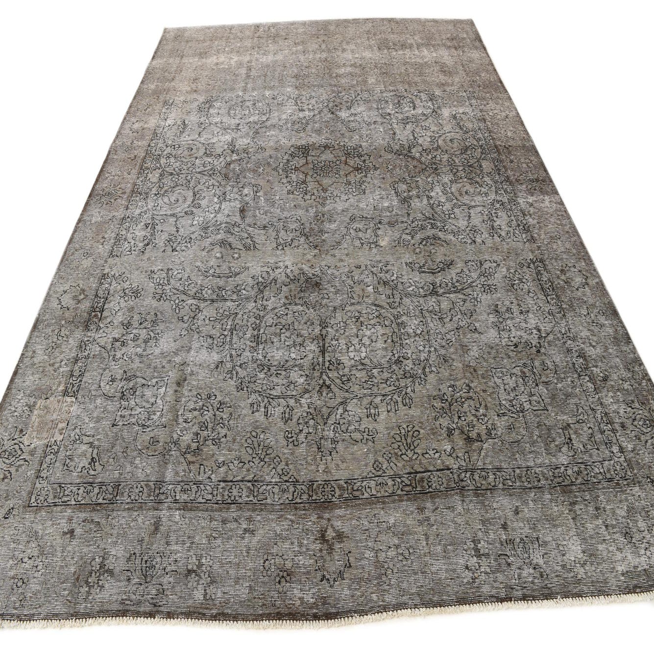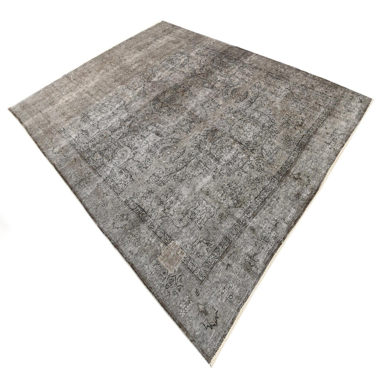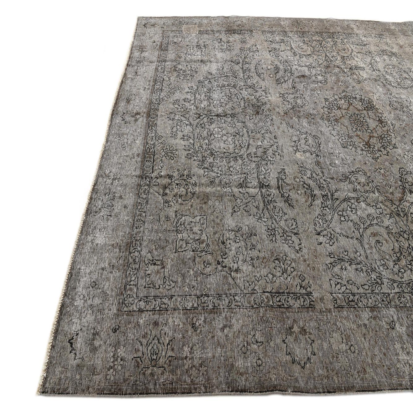 A 9x12 rectangular gray wool area rug with a faded Persian floral pattern, ideal for a living room.