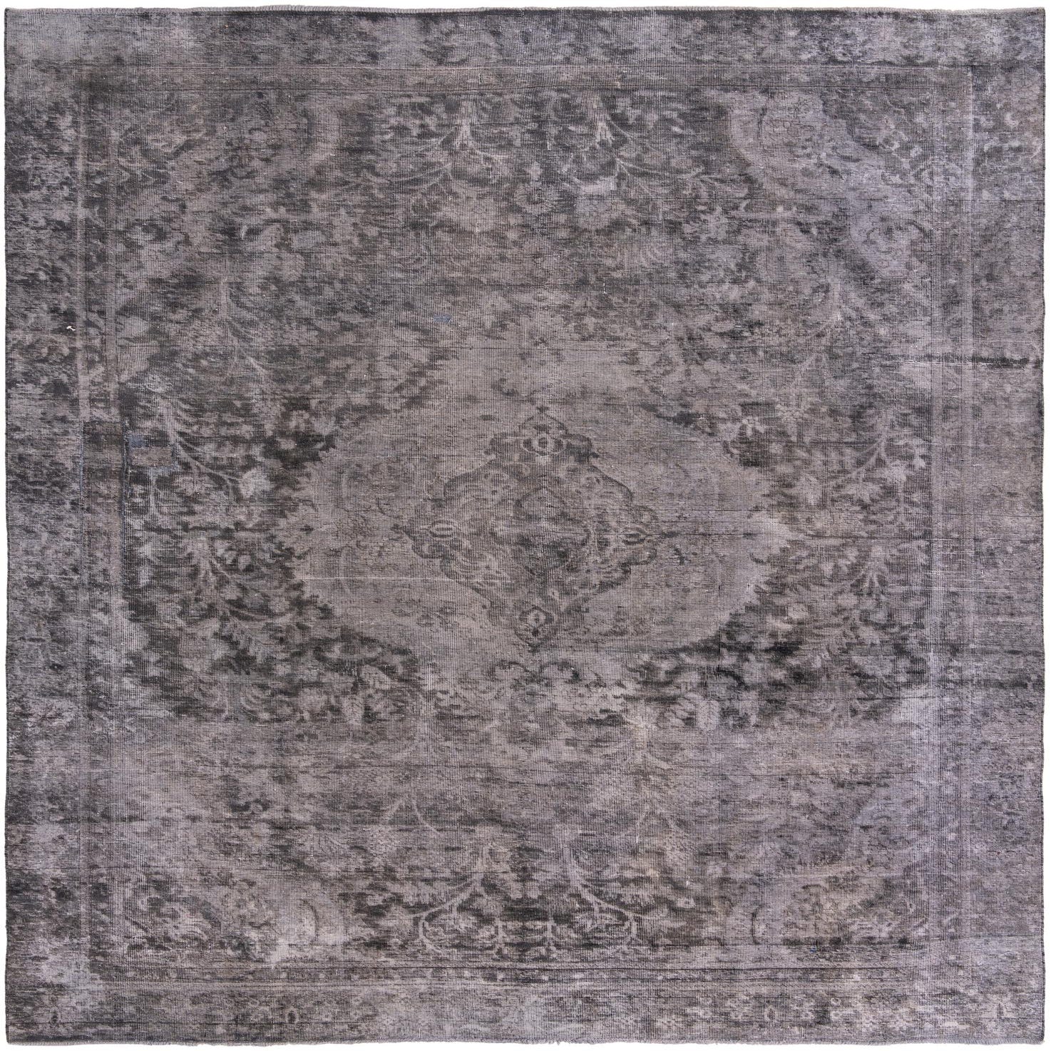 A 9x12 rectangular gray wool rug with a distressed Persian medallion and floral pattern, suitable for a living room.