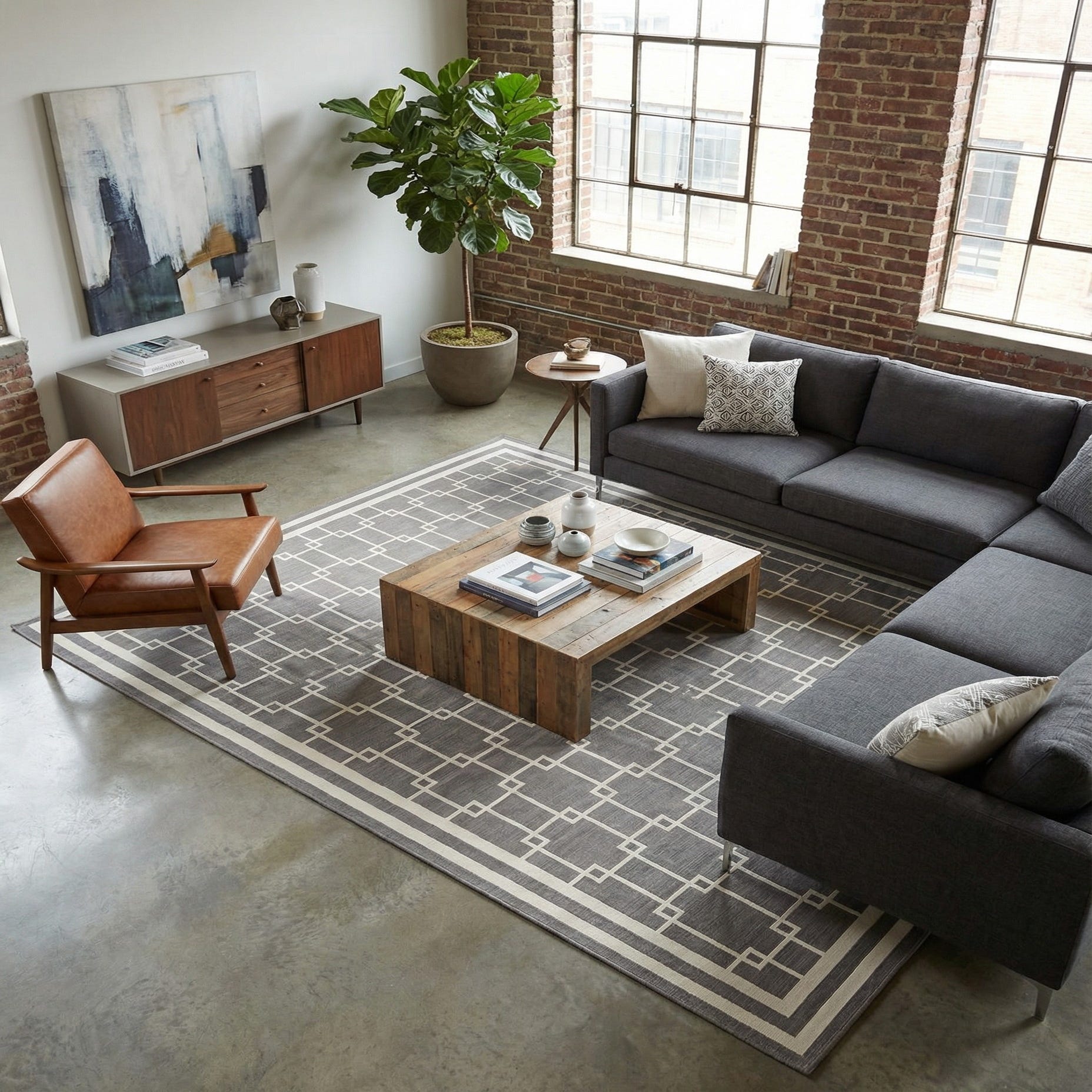 This rug pairs naturally with contemporary, transitional, or mid-century interiors—place it beneath a streamlined sofa grouping to define a living area, under a dining table to ground a larger room, or layered in a master bedroom for a finished look. It also works well in a professional home office or entry where the graphic pattern provides visual order; pair with white or wood furniture, matte metals, and muted accents to maintain a calm, cohesive palette.