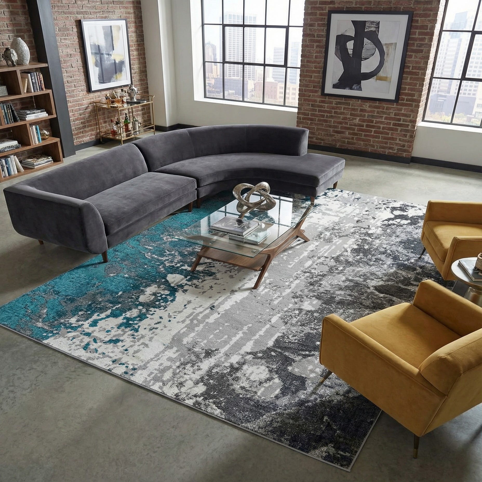 This piece complements contemporary and coastal-inspired interiors alike — pair it with light woods and linen upholstery to accent the blues, or anchor a monochrome living room with charcoal sofas to bring out the darker tones. It also works well in a minimalist bedroom or an urban loft dining area, where the dynamic pattern adds visual interest without competing with other décor.