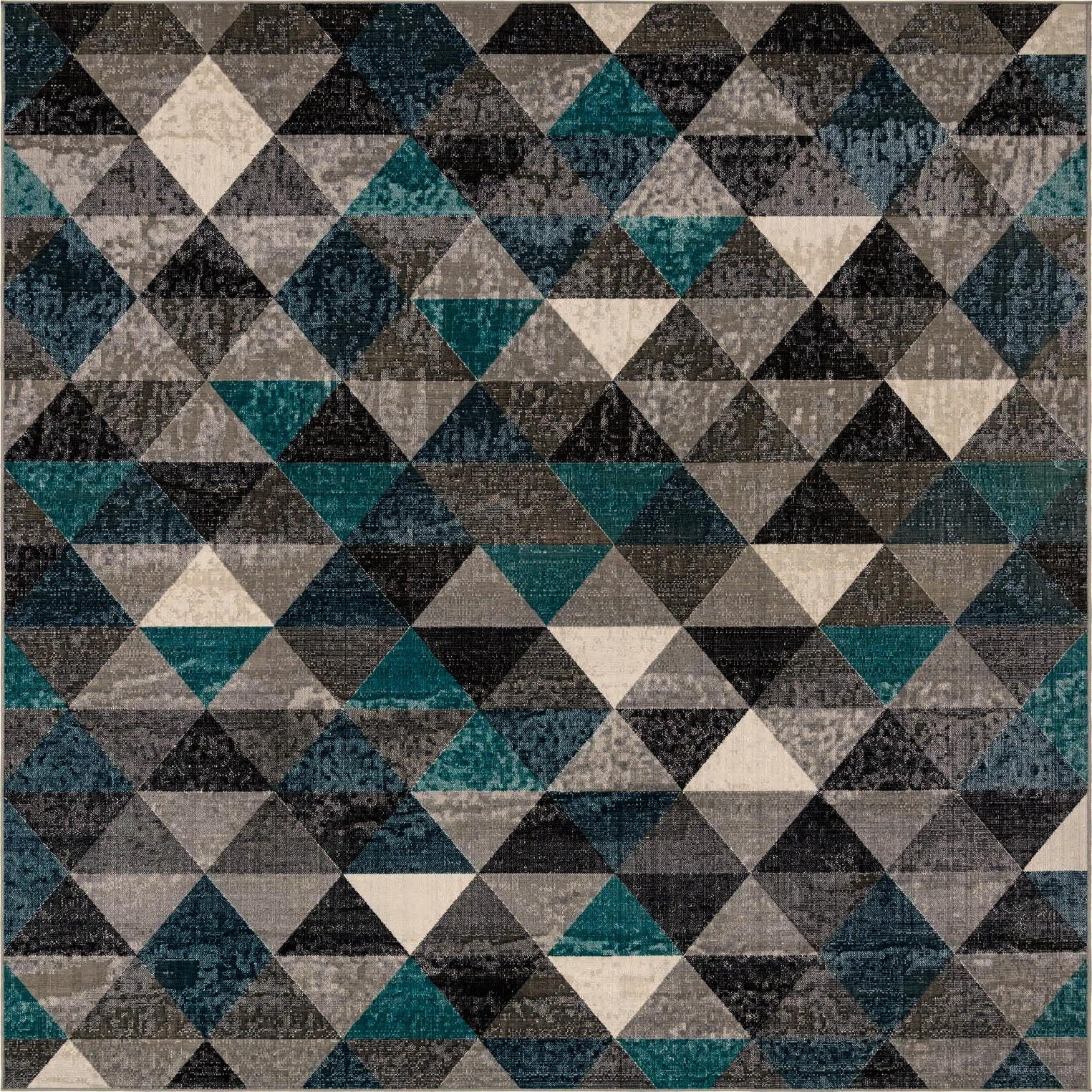 A 9x12 rectangular area rug featuring a modern geometric pattern of triangles in various shades of gray, black, white, and teal, suitable for a living room.
