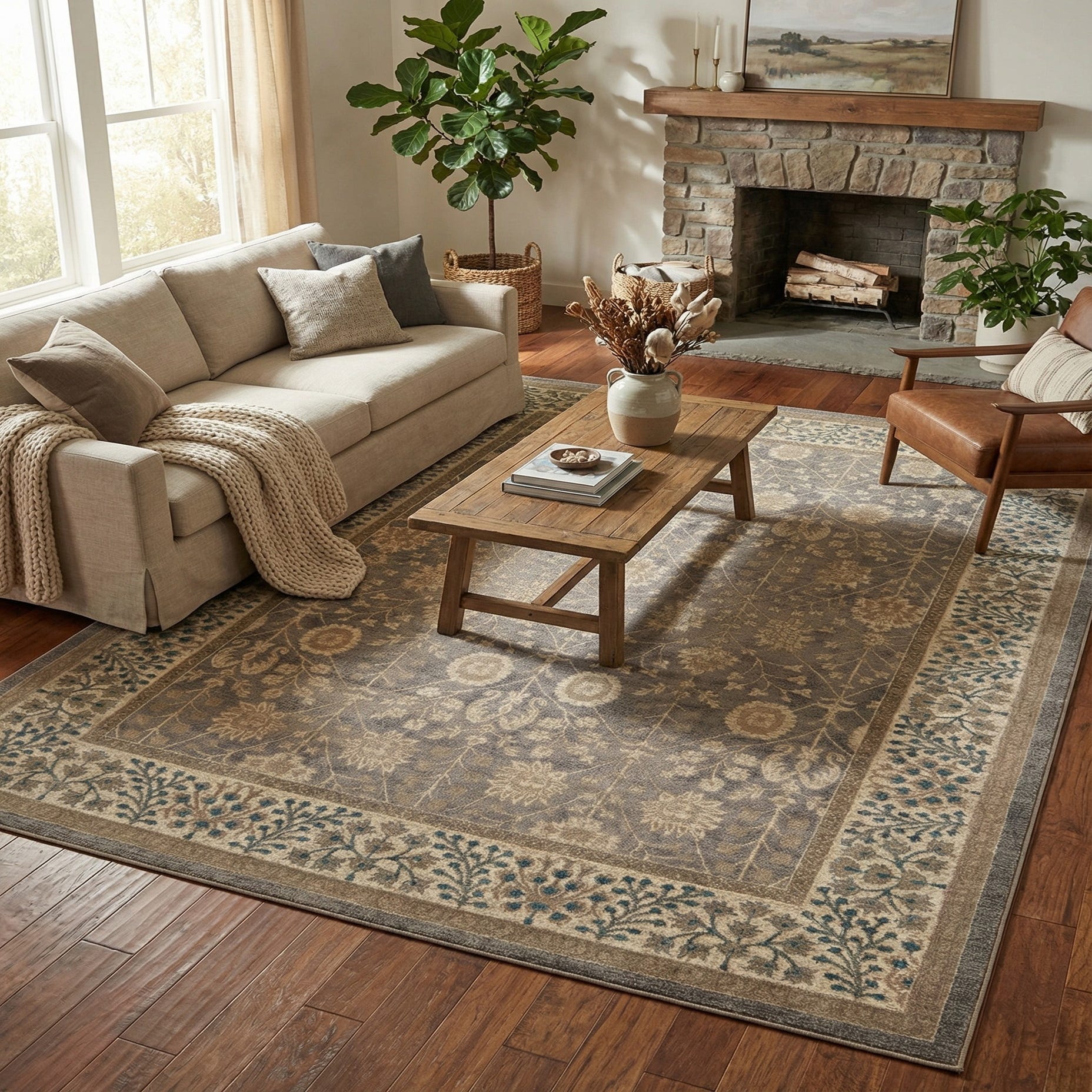 I’ve had this a few weeks and it’s beautiful. It lays flat is nice and dense soft and doesn’t have any odors. It came rolled in heavy plastic. I used the preview feature and it was pretty accurate. I wanted something to cozy up the room with a pattern that is subtle and this rug is that!