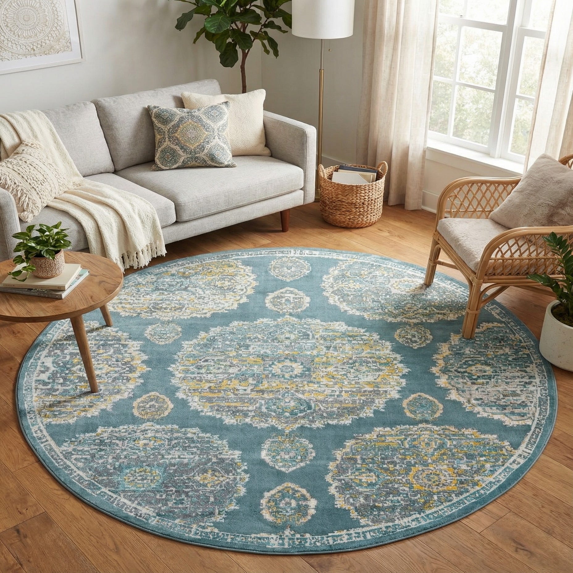 This piece fits easily into coastal, transitional, or contemporary-traditional interiors. Place it beneath a round dining table to reinforce shape, anchor a living room seating group in soft neutrals and light woods, or add calm color to a bedroom seating area. Pair with linen upholstery, painted furniture in white or muted gray, and a few yellow or green accents to echo the rug’s subtler tones.