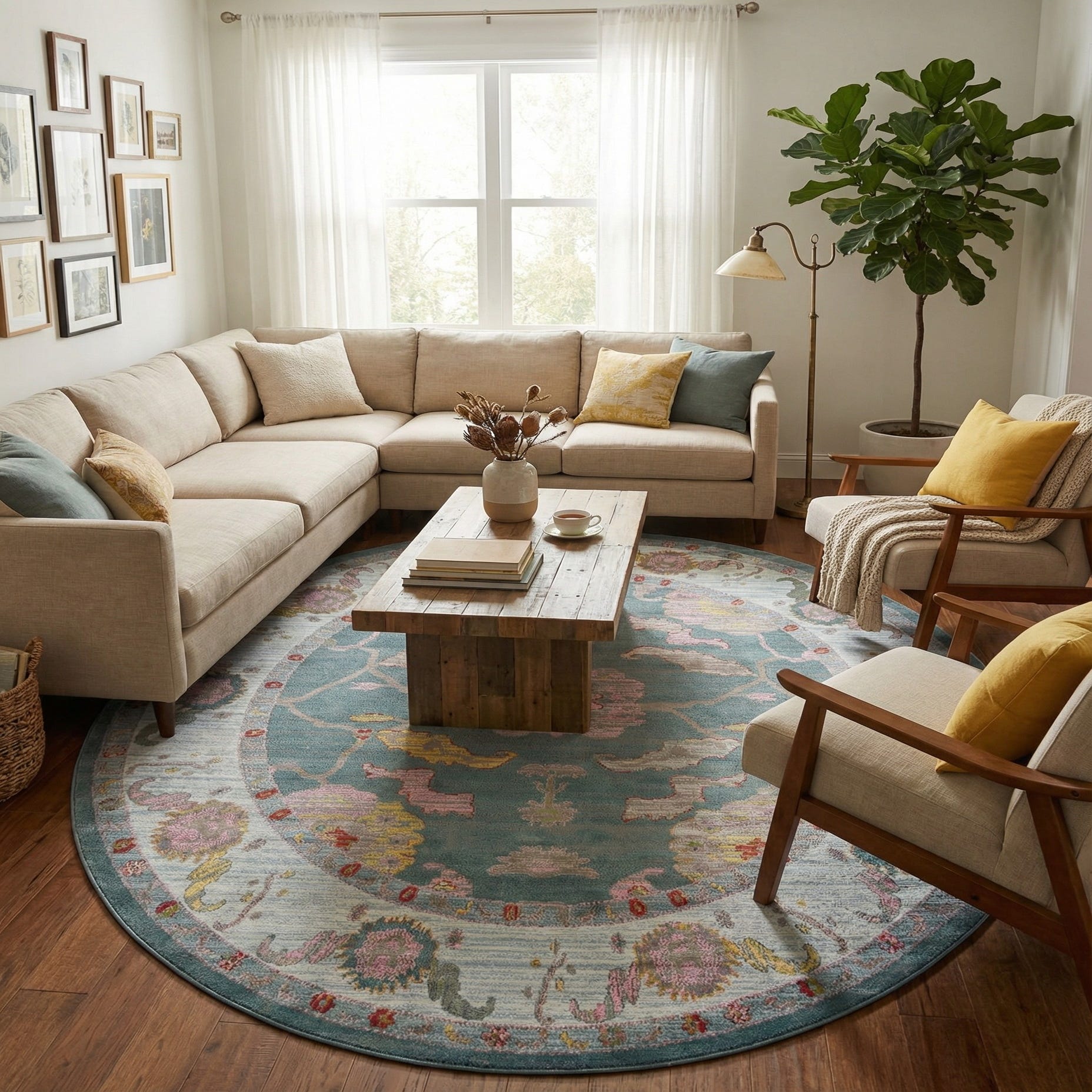 Machine made of 100% polypropylene, the rug has a low, dense pile that feels smooth and slightly cushioned underfoot, with a subtle sheen where light catches the yarns. Its oval shape and balanced color palette make it a natural fit for a cozy living room seating area, beneath an oval or round dining table, or at the foot of a bed to add color without overwhelming a calm palette. Pair it with light wood finishes, soft blue or blush upholstery, and brass or aged-metal accents for a transitional or coastal-inspired interior, or introduce it to a contemporary traditional space to soften sharper lines.