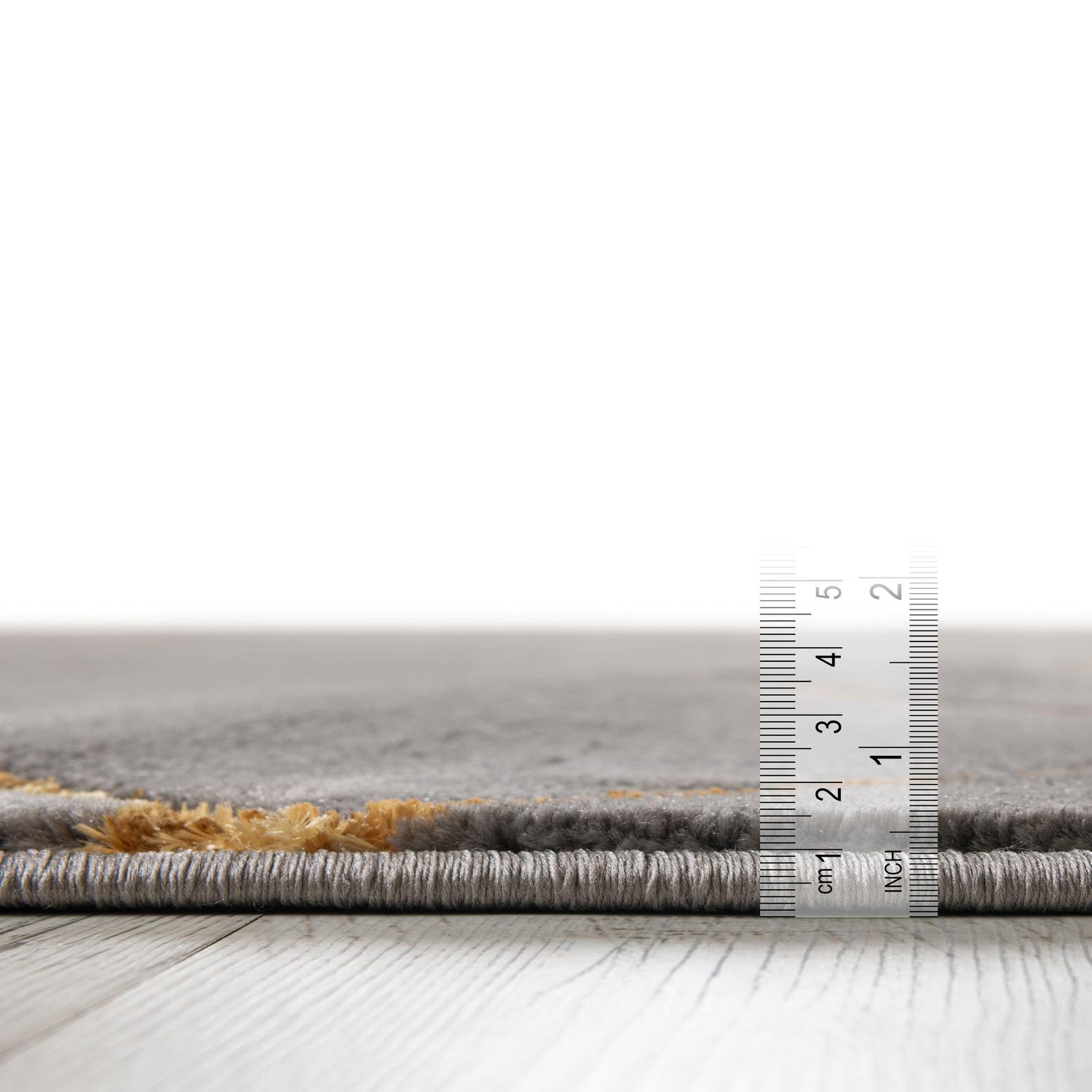 This rug suits modern and transitional interiors—pair it with mid-century seating and brass or gold hardware for a contemporary look, place it beneath a minimalist sofa and coffee table to anchor a living area, or use it to add polish to a bedroom or home office. Its balanced palette of gray and gold works well over wood or tile floors and coordinates with cool neutrals, charcoal, and warm metallic finishes.