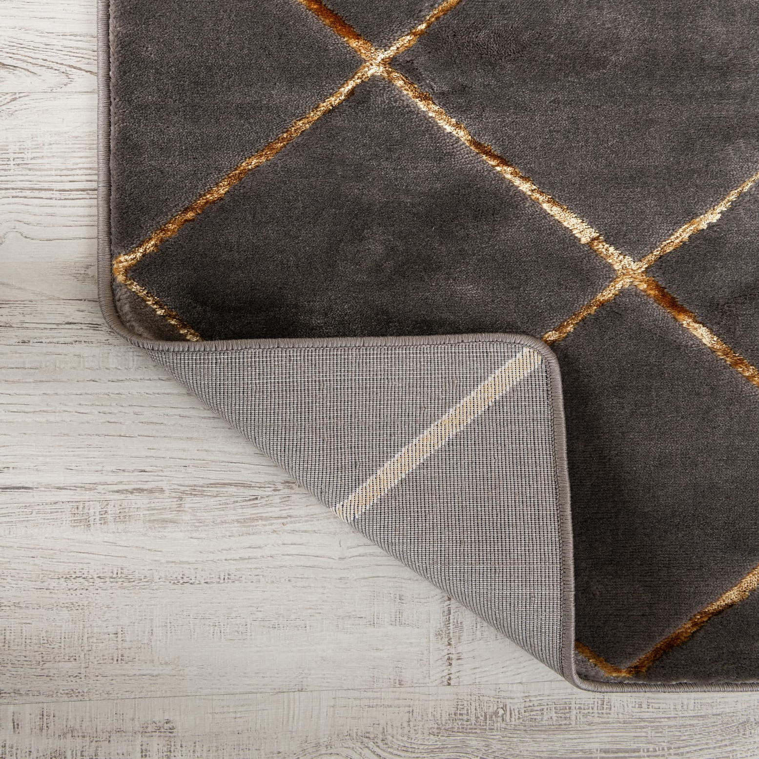 A clean geometric diamond lattice rests across a soft gray field, with warm gold lines tracing each intersecting point. The slim, slightly raised gold bands add a subtle low-relief texture against the smooth cut-pile surface, creating visual interest without heavy patterning. Machine-made construction in 70% polypropylene and 30% polyester produces a soft, velvety hand with a gentle sheen that complements both matte and metallic accents.