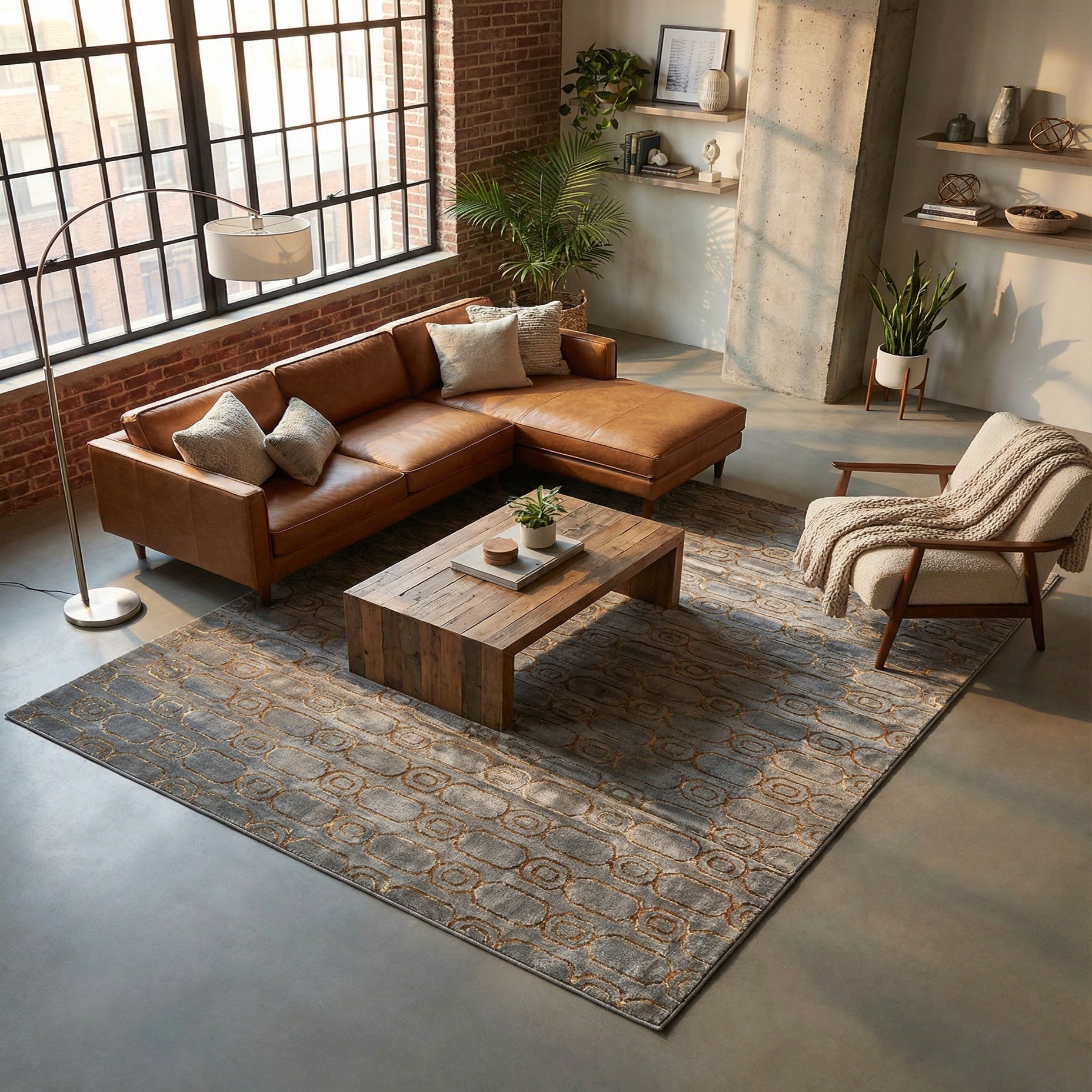 This rug works well anchored beneath a living room seating group, layered in a large bedroom, or placed in a home office to introduce pattern without overwhelming the space. Pair it with cool neutrals and brushed-metal finishes for a contemporary look, or mix it with walnut furniture and brass accents to bring out the gold tones for a warmer, mid-century inspired palette.