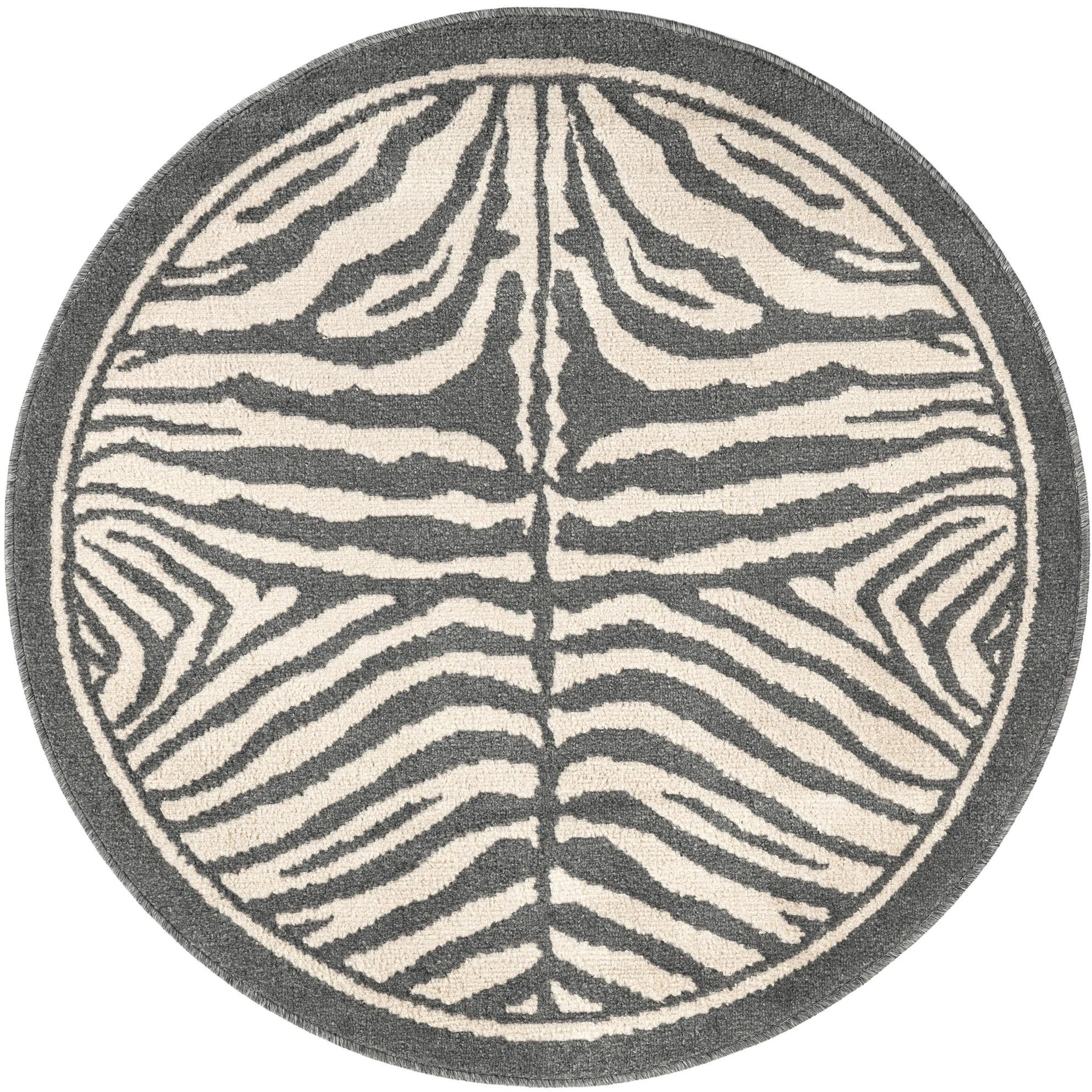 A 4' round ivory and gray zebra print rug with a modern stripe pattern and medium pile.